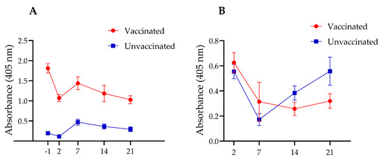 Although higher intestinal sIgA levels were observed in the vaccinated group during the first two post-mortem time points (2 and 7 days post-challenge), as compared with the unvaccinated group, these differences were not statistically significant (Figure 3B). However, the unvaccinated group exhibited a delayed but significant rebound in sIgA levels at later postmortem timepoints (14 and 21 days post-challenge), with a statistically significant increase observed at 21 days post-challenge. These findings suggest that vaccination may trigger an early mucosal immune response that initially declines as Salmonella is cleared from the intestines and subsequently stabilizes over time. In contrast, unvaccinated chickens experience an initial suppression of sIgA levels, followed by a delayed compensatory increase in response to persistent Salmonella colonization.