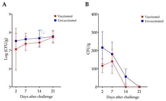 Comparison of S. Enteritidis counts in the cecum (A) and spleen (B) of vaccinated and unvaccinated chickens. There was no statistically significant difference in Salmonella counts between the two groups.