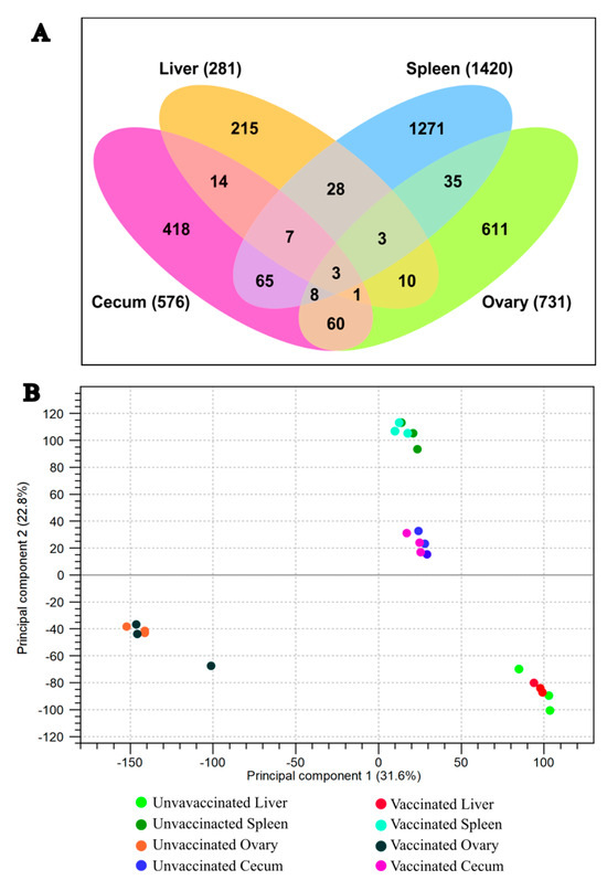 Principal component analysis (PCA) was conducted to assess the heterogeneity among replicates and between treatments. The PCA plot showed clear clustering of groups, indicating consistent transcriptomic changes in biological replicates of the vaccinated and unvaccinated groups (Figure 5B). Differential expression of genes in each tissue (liver, spleen, ovary, and ceca) is presented in Figure 6A–D, respectively.