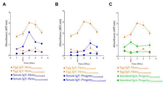 Transfer of maternal antibodies. Correlation of (A) egg IgY levels with serum IgY levels in hens, (B) egg yolk IgY and serum IgY levels in progeny chicks, and (C) egg IgY and intestinal sIgA levels in progeny. The red Arrow indicates the 3rd vaccination event, and the time indicates weekly egg collection events.