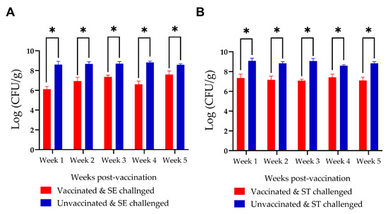 Comparison of Salmonella counts in the ceca of progeny chickens from vaccinated and unvaccinated hens following challenge with (A) Salmonella Enteritidis (SE) and (B) Salmonella Typhimurium (ST). Progeny from vaccinated hens exhibited a significant reduction in Salmonella counts in both the SE- and ST-challenged groups. * denotes a statistically significant difference between groups.