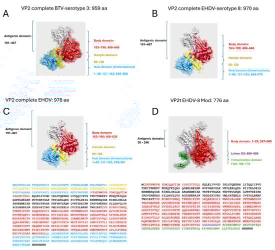 (A,B) A 3D predicted structure comparison between BTV and EHDV viruses defining the different protein domains (Hub domain, Hairpin domain, Antigenic domain, and Body domain). (C,D) A 3D predicted structure of the wild-type VP2 protein of EHDV (labeled “Full-length VP2 EHDV-8”) and the fusion protein of the present invention (labeled “VP2t EHDV-8 Mod”). The trimerization domain includes a GGGS linker at the C-terminus followed by a polyhistidine tag.