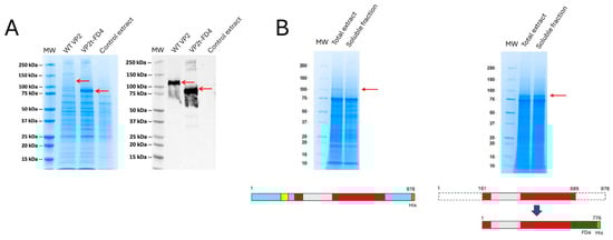 Protein expression SDS-PAGE analysis. (A) VP2-EHDV-8 and VP2t-EHDV-8 Mod proteins expression in sf9-RVN insect cells, analyzed by Coomassie blue staining and detected by Western blot using an anti-Histidine monoclonal antibody. Red arrows indicate the recombinant protein. (B) Protein expression in infected pupae extracts, total and soluble extracts analyzed by Coomassie blue stain. Red arrows indicate the recombinant protein. Below each gel, there is a schematic representation of the protein domains included in the constructs.