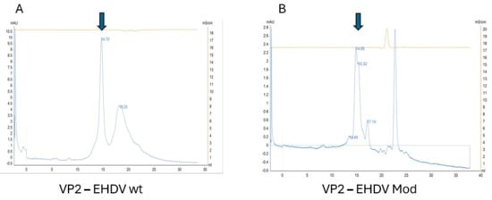 The VP2 protein of EHDV forms the outer capsid layer of the virion and is essential for viral assembly and host cell entry [36,37,38]. Owing to its antigenic properties, VP2 represents a major target for vaccine development [63,64,65]. However, the recombinant production of VP2 is limited by low stability and poor yields, representing a significant barrier for the generation of safe and effective subunit vaccines. This conclusion is based on the results presented in this study. Previous work in which the VP2 protein was produced from EHDV-2 and EHDV-6 [46] or from EHDV-8 [47] did not report the yield of the expression and purification processes. These studies also did not provide Coomassie blue–stained SDS-PAGE gels or protein stability assays. This lack of comparable data makes it difficult to evaluate the expression of our modified VP2 protein relative to other VP2 proteins previously expressed using the baculovirus system.