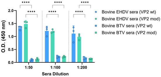 First, we assessed the antigenicity of the recombinant VP2 proteins by indirect ELISA using sera from bovines naturally infected with either EHDV or BTV. As shown in Figure 5, only sera from animals infected with EHDV recognized the two recombinant EHDV-derived proteins, whereas sera from BTV-infected bovines showed no reactivity, which indicates the absence of cross-reactivity between VP2 proteins from distinct orbiviral origins. In addition, no differences were found between the IgG responses of sera from EHDV-infected bovines against the wild-type and the modified VP2 proteins (Figure 5).