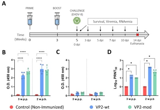 We evaluated the induction of a humoral immune response by the VP2-based subunit vaccine candidates. To do so, we collected sera at 4 weeks post-prime-vaccination (w.p.p.) and 2 weeks post-boost-vaccination (w.p.b.), and assessed the presence of IgG antibodies specific to protein VP2 of EHDV-8. Antibodies specific to the VP2 protein of EHDV-8 could be detected in all mice immunized with either wild-type or engineered VP2 proteins (Figure 6B). Levels of VP2-IgG slightly increased after the booster in both immunization groups (Figure 6B). We also performed an indirect ELISA test for the detection of IgG antibodies against the recombinant protein VP7 of EHDV. No antibodies specific to protein VP7 could be detected prior to challenge in any of the immunization groups (Figure 6C), which highlights the DIVA character of both subunit vaccine candidates. In addition, we measured neutralizing activity against EHDV-8 or EHDV-6 in sera collected by classic PRNT50. Immunized animals displayed detectable titers of homologous virus-NAbs after one dose and high PRNT50 titers after two doses of each recombinant protein (Figure 6D). No statistical differences were found between the immunization groups regarding EHDV-8 NAbs titers. Unsurprisingly, neither the wild-type VP2 nor the modified VP2 vaccine candidates induced cross-neutralizing responses against EHDV-6. Overall, immunization with either VP2-wt or VP2-mod leads to the induction of identical humoral immune responses against EHDV, indicating that the modifications introduced in the sequence of protein VP2 do not alter its immunogenicity.