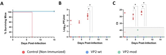 Recently, IFNAR(−/−) mice have been established as a suitable animal model for EHDV infection and vaccine evaluation [59]. To test the immunogenicity and protective capacity of the two recombinant VP2 proteins, three groups of IFNAR(−/−) mice (n = 5 per group) were subjected to a prime–boost vaccination regimen. Two groups received intramuscular injections of 30 μL vaccine containing 30 μg of either wild-type or engineered VP2 protein, formulated with Freund’s Adjuvant (complete for the prime and incomplete for the boost). A third group served as a negative control and was administered adjuvant only. The booster immunization was delivered four weeks after the prime. Two weeks after the booster dose, mice were subcutaneously challenged with a lethal dose (100 PFU) of EHDV-8. Subsequently, the mice were monitored for survival, and viremia and RNAemia were analyzed by plaque assay and RT-qPCR, respectively.