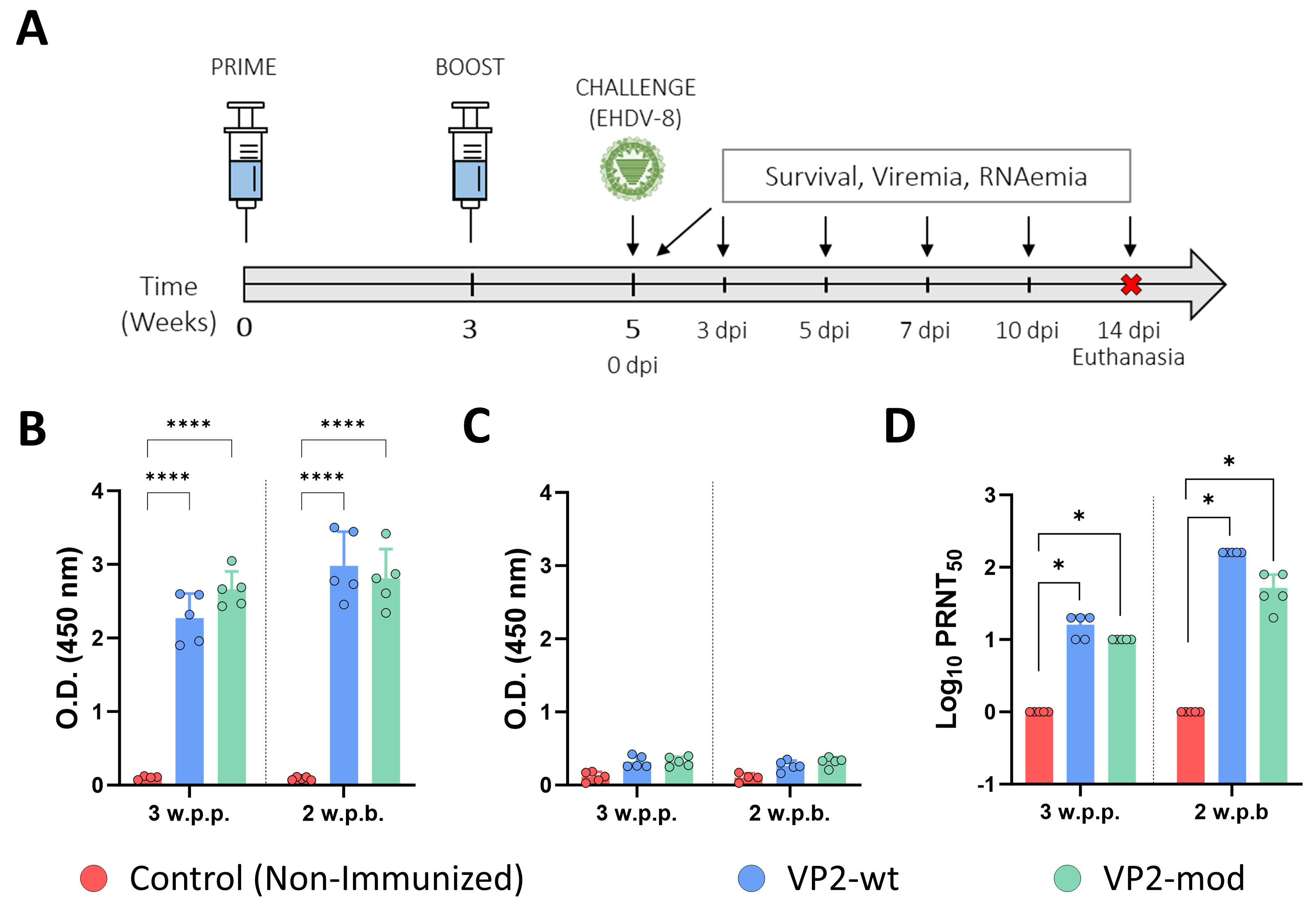 - Jiménez-Cabello, L.; Utrilla-Trigo, S.; Rodríguez-Sabando, K.; Carra-Valenzuela, A.; Illescas-Amo, M.; Calvo-Pinilla, E.; Ortego, J. Vaccine Candidates Based on MVA Viral Vectors Expressing VP2 or VP7 Confer Full Protection against Epizootic Hemorrhagic Disease Virus in IFNAR(−/−) Mice. J. Virol. 2024, 98, e01687-24. [Google Scholar] [CrossRef]