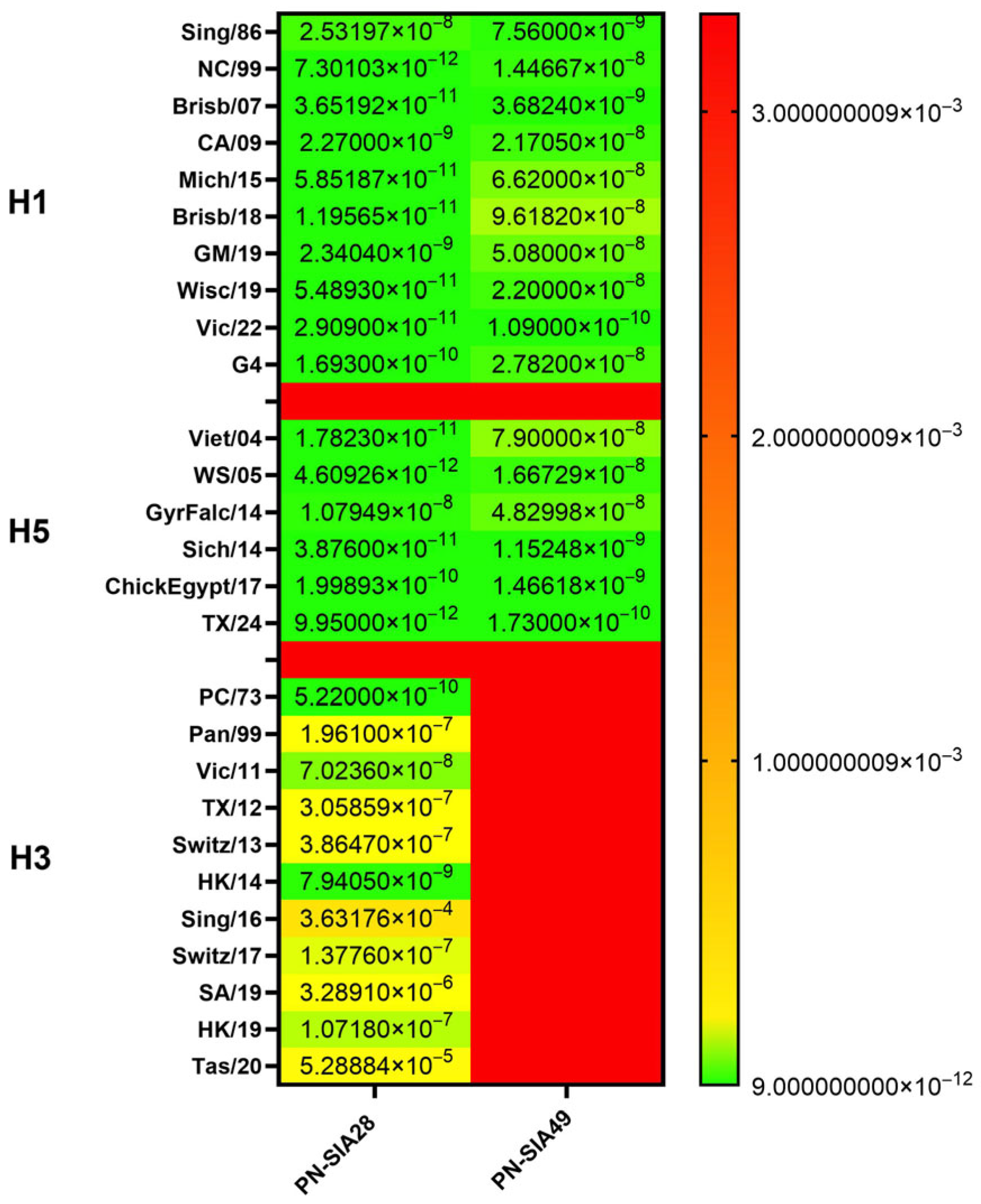 Additionally, these antibodies demonstrated therapeutic efficacy against HPAIV H5Nx influenza strains belonging to the clades 2.3.4.4 and 1 such as H5N6 A/Shenzhen/TH002/2016 (PN-SIA28) and H5N1 A/Vietnam/1203/2004 (PN-SIA49) [