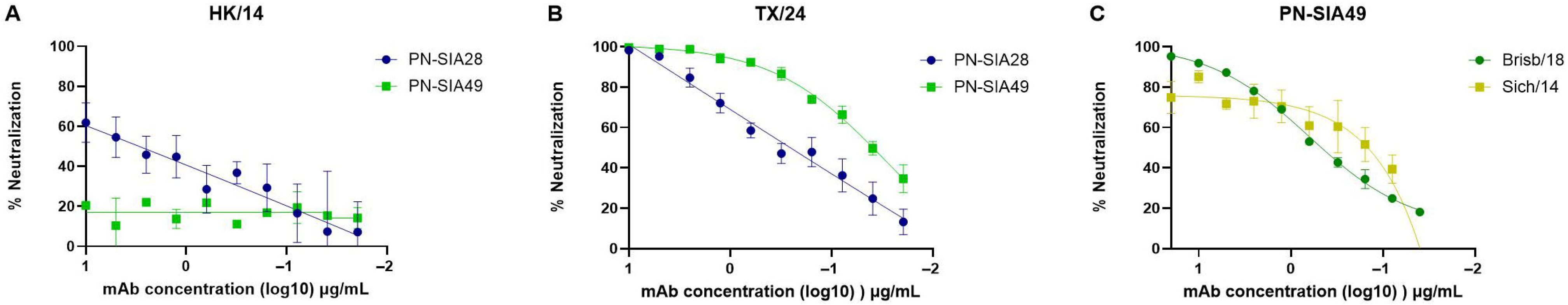 41]. Furthermore, pMN assays against TX/24 showed a stronger neutralizing activity for PN-SIA49 compared to PN-SIA28, despite a higher affinity of PN-SIA28 against TX/24 HA compared to PN-SIA49. This discrepancy underlies that these two mAbs recognize different epitopes and that the accessibility of the epitopes may vary depending on the displayed HA glycoprotein as well as their role in the viral life cycle.