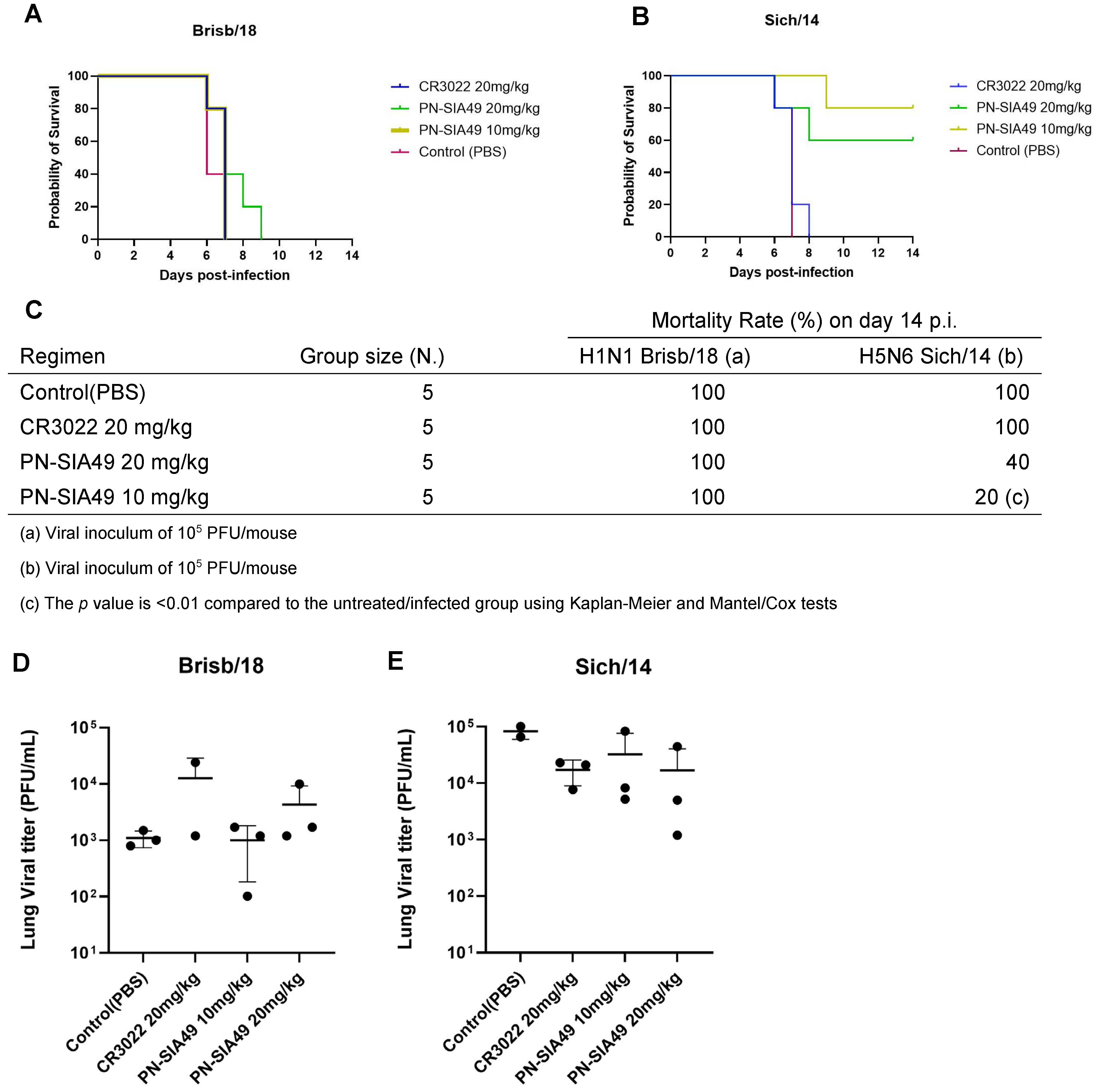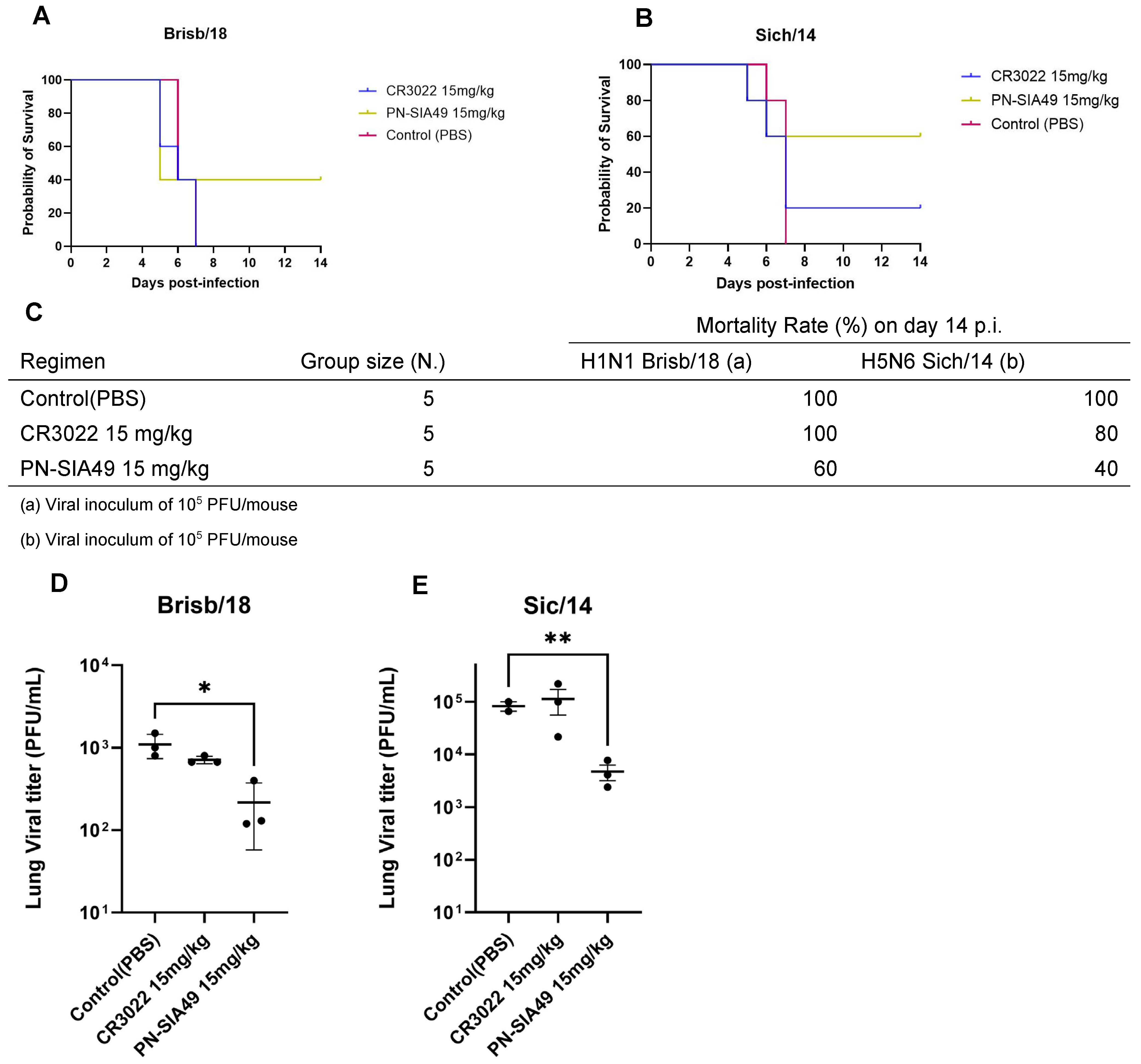 9]. Here, we tested the PN-SIA49 for its ability to protect mice against the same clade. Importantly, PN-SIA49 was able to reduce the mortality and lung infection from the clade 2.3.4.4b H5N6 virus (Sich/14), in both prophylactic and therapeutic studies, even when tested at the lower dose (10 mg/kg in the prophylactic study). However, in both the prophylactic and therapeutic studies against the Brisb/18 strain, PN-SIA49 provided a lack of or lower protection than against the Sich/14 strain. This difference is likely due to the lower binding affinity of PN-SIA49 for Brisb/18 (Kd of ~10