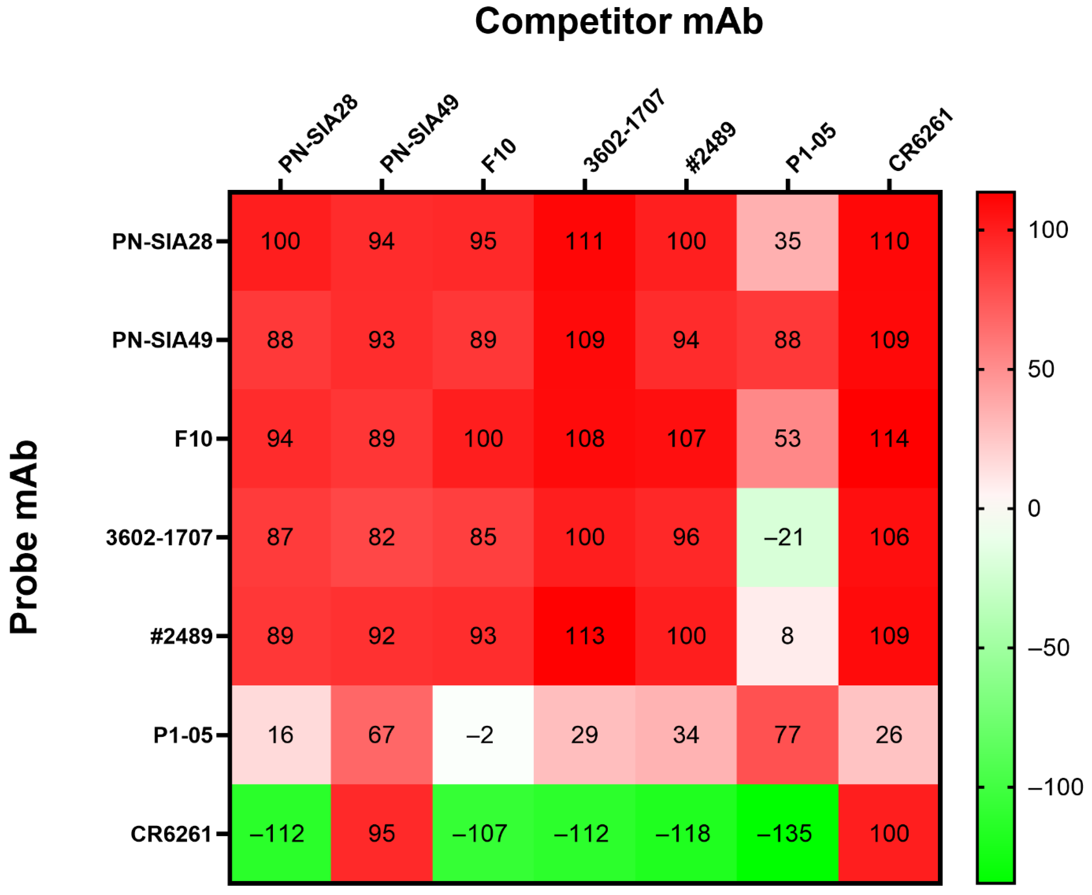 Competition levels were quantified as percent inhibition using the formula: percent inhibition = 100 × [(signal of probe mAb alone − signal of probe mAb with competitor mAb)/signal of probe mAb alone]. A percentage inhibition ≥ 75% was considered complete competition, 35–74% indicated moderate competition, and <35% indicated no competition.