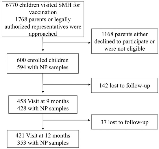 A total of 600 children were enrolled in the study with 594 (99%) providing both clinical data and nasopharyngeal swabs at enrolment. Follow-up rates declined over time, with 428 (71%) children providing samples at 9 months and 353 (59%) children at 12 months (Figure 1).