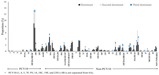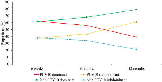 Nanofluidic qPCR revealed a high prevalence of multiple-serotype carriage, allowing classification of pneumococcal vaccine serotypes by dominance based on Ct values and relative abundance. As shown in Appendix A Figure A2, in addition to the serotype distribution of dominant serotypes, serotype distributions of a substantial number of second most dominant serotypes and non-negligible number of third most dominant serotypes were disclosed. Overall, non-PCV10 serotypes were predominant across all time points, including even before the immunization (6 weeks). PCV10 serotypes appeared less frequently, particularly in dominant and second dominant positions, suggesting reduced nasopharyngeal colonization of vaccine-covered serotypes post-vaccination. At 6 weeks, the proportion of dominant PCV10 serotype was nearly identical to that of non-PCV10 serotype (57/91, 62.6% vs. 105/174, 60.3%), and the same pattern was observed for the proportion of subdominant PCV10 serotypes (34/91, 37.3% vs. 69/174, 39.6%). However, these proportions diverged over time, depending on whether the serotype was included in PCV10. The proportion of PCV10 serotypes detected as subdominant increased over time from 37.3% (34/91) at 6 weeks, to 43.8% (39/89) at 9 months, and 61.1% (11/18) at 12 months (p = 0.17 by chi square test). In contrast, the proportion of non-PCV10 serotypes detected as subdominant showed a decreasing trend from 39.6% (69/174) at 6 weeks, 34,2% (92/269) at 9 months, and 22.4% (34/170) at 12 months (p < 0.001) (Figure 2).