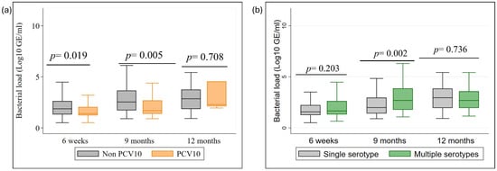 We compared bacterial load over time, as shown in Figure 4. Non-PCV10 serotypes consistently exhibited higher bacterial loads than PCV10 serotypes at all time points (Figure 4a). The difference was statistically significant at 6 weeks (p = 0.019) and 9 months (p = 0.005) but not at 12 months, likely due to the small number of cases of PCV10 serotype at 12 months and the presence of outlier cases, particularly cases of serotype 19F (n = 5) and 23F (n = 2) showed a relatively high bacterial load (p = 0.708) (Appendix A Figure A4). In Figure 4b, at 9 months, individuals with multiple serotypes had significantly higher bacterial loads compared to those with a single serotype (median: 3 log10 GE/mL, p = 0·002). This difference was not significant at 6 weeks and 12 months.