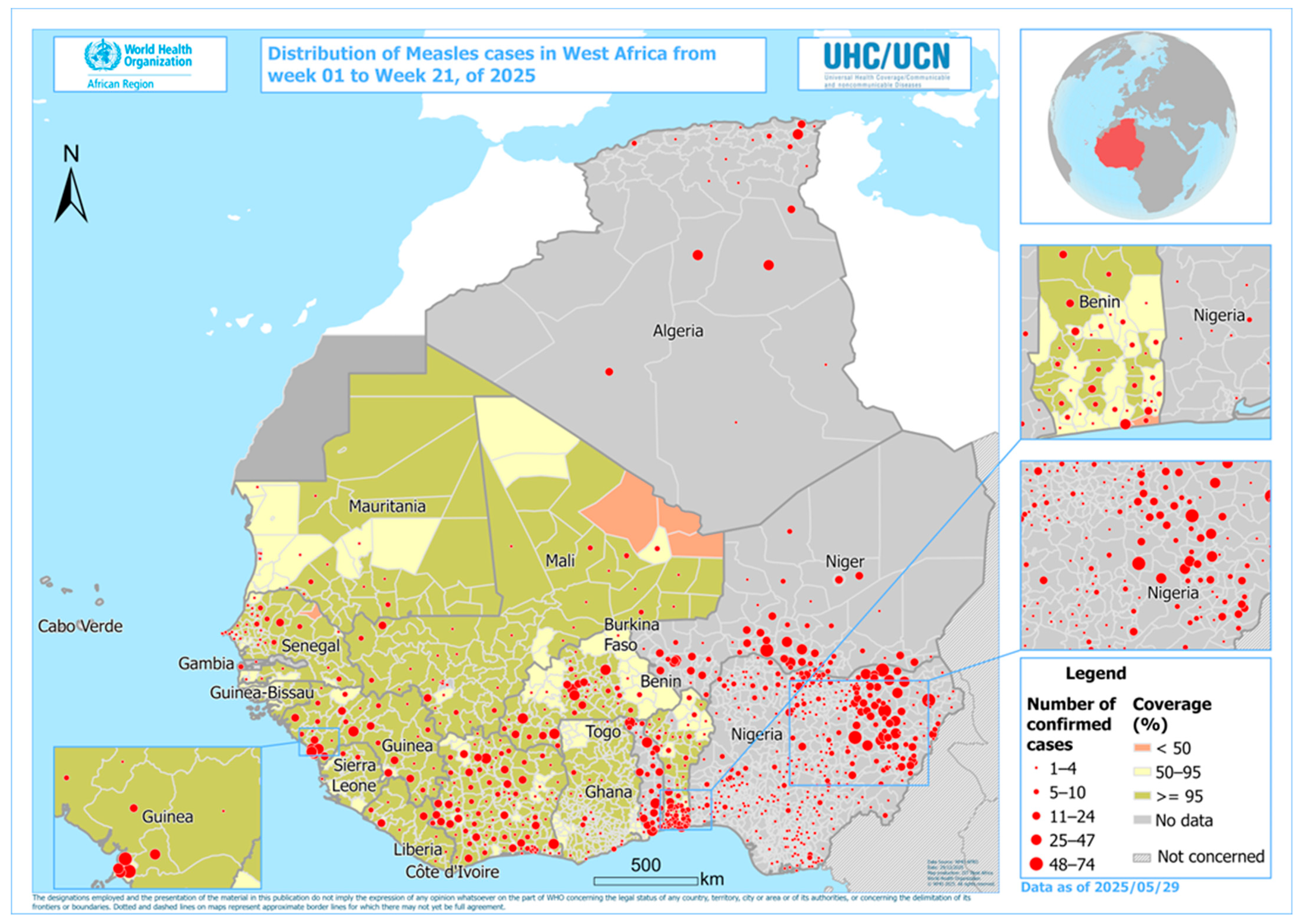- Vaccination gaps: 22 million children worldwide did not receive their first dose of measles vaccine in 2022, with West Africa contributing 3.2 million of these [5];