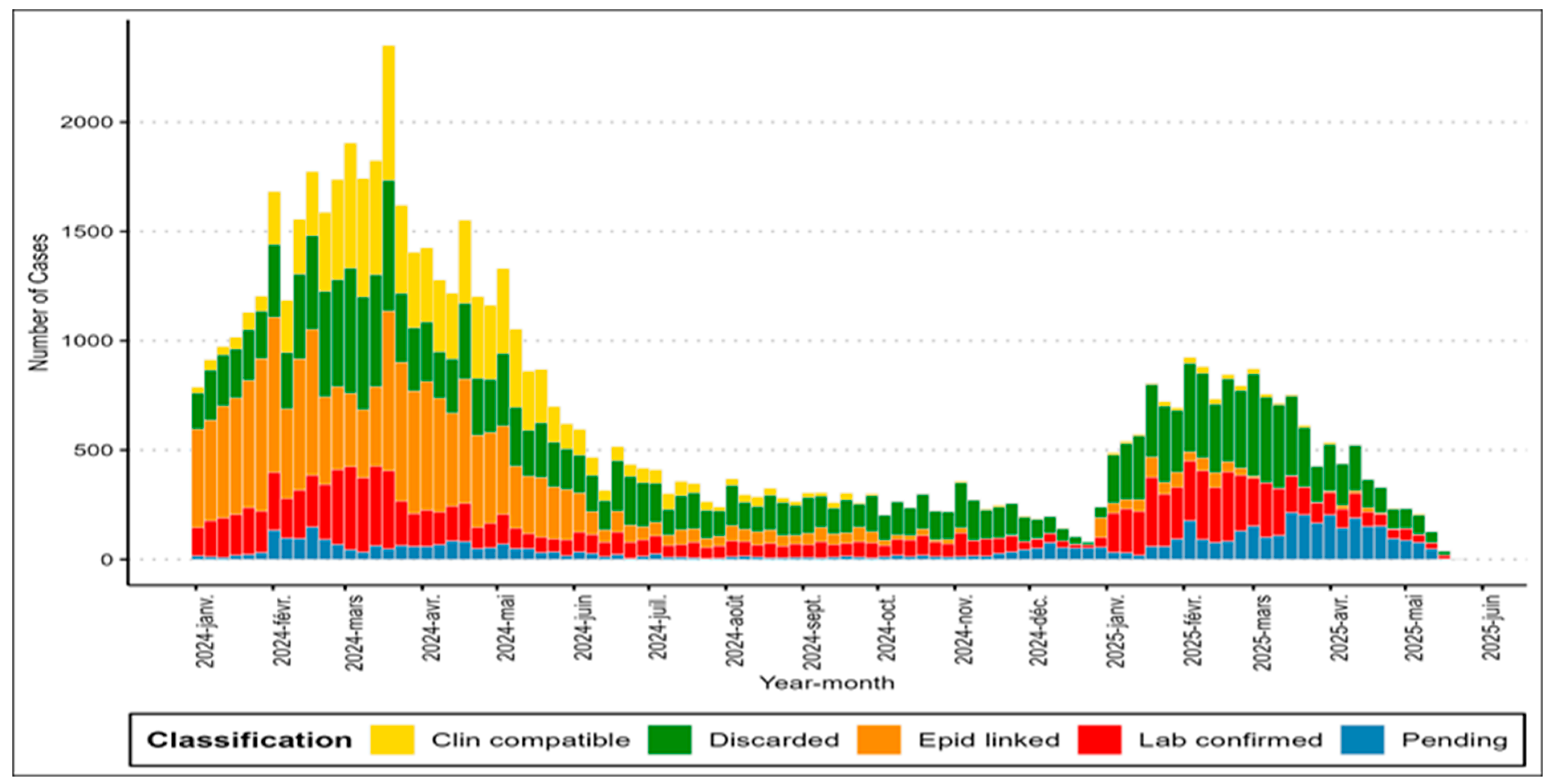 - Tague, C.; Alhassan, A.; Rusho, M.A.; Basaria, A.A.A.; Fatima, I.; Yokolo, H.; Ekouo, J.; Makeda, D.; Shangalume, F.I.; Cakirwa, H.; et al. Monkeypox and measles: Two scourges among war-displaced children in the eastern region of the Democratic Republic of Congo. Ann. Med. Surg. 2025, 87, 7719–7720. [Google Scholar] [CrossRef]