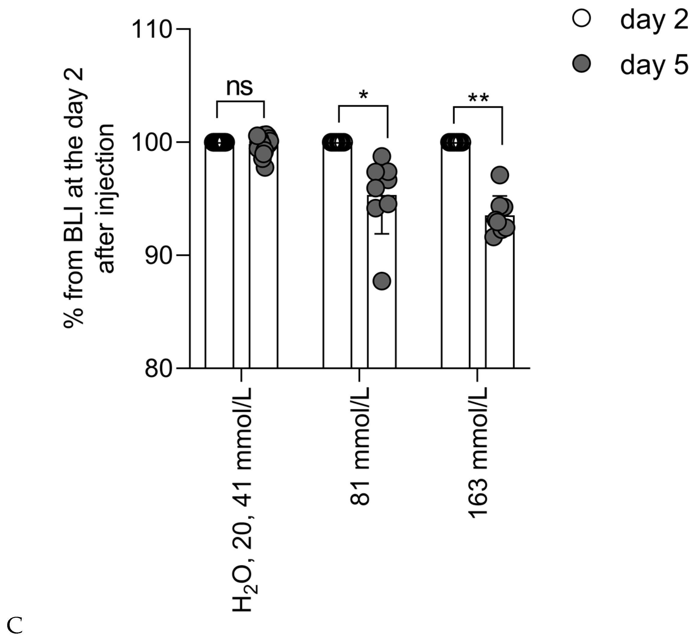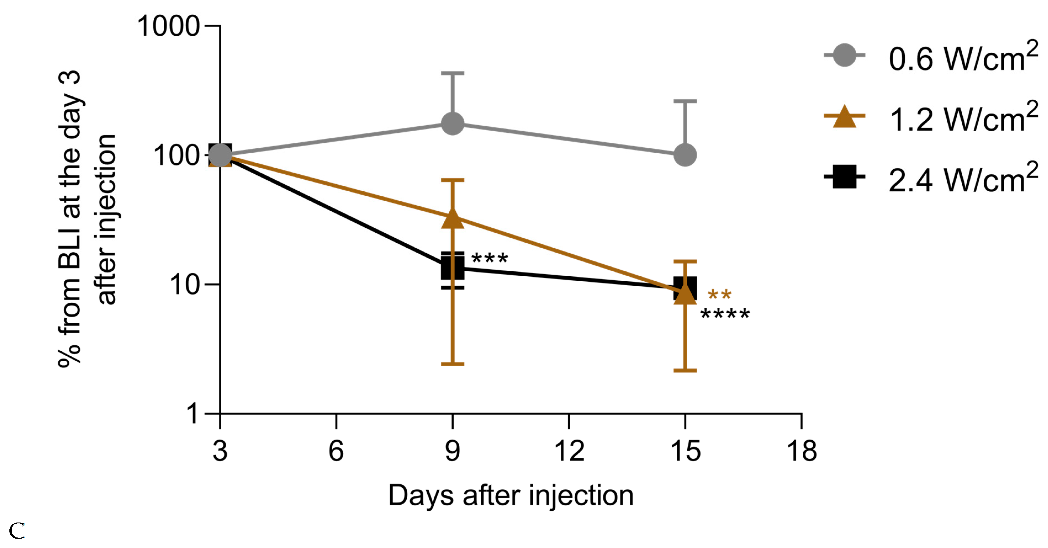 2.8. In Vivo Bioluminescent Imaging (BLI)