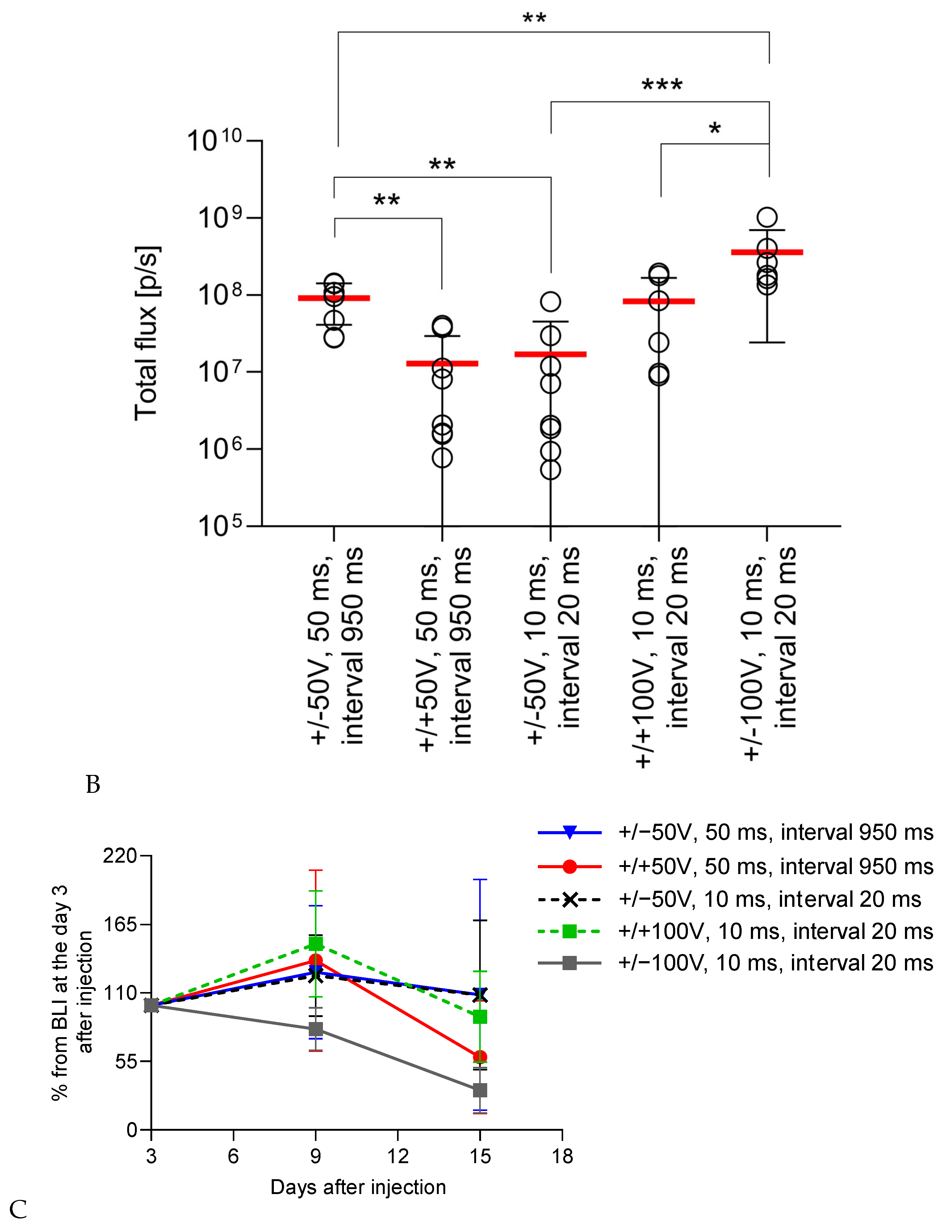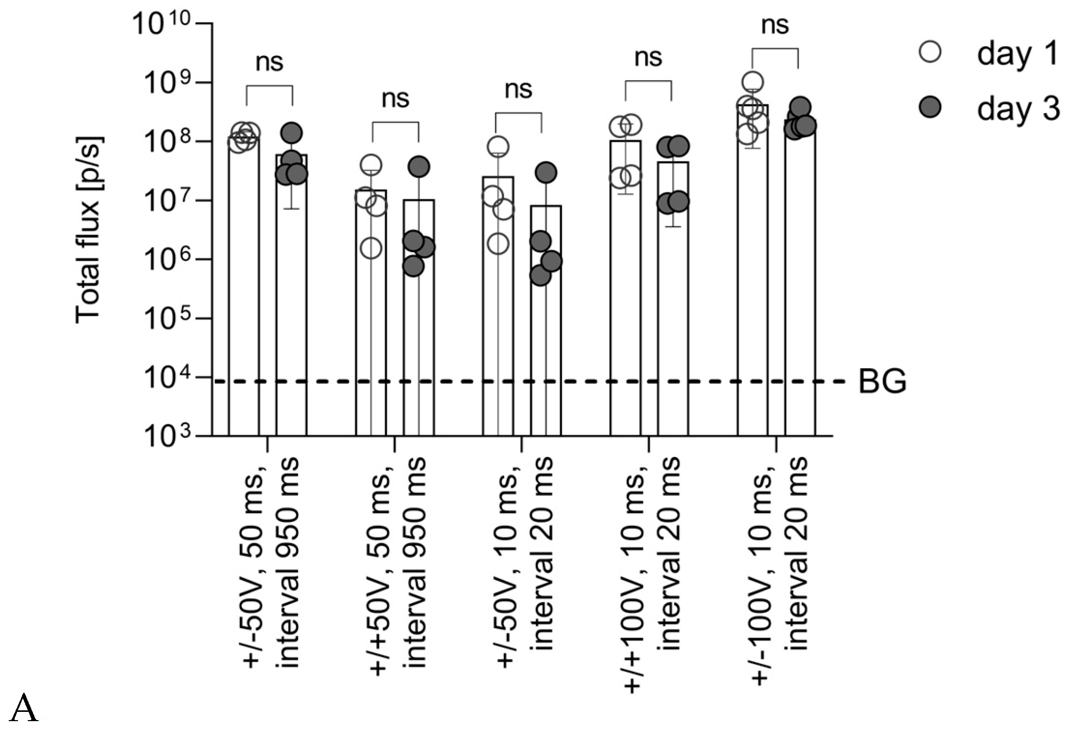 2.6. Optimization of In Vivo Delivery of Plasmid DNA by Electroporation