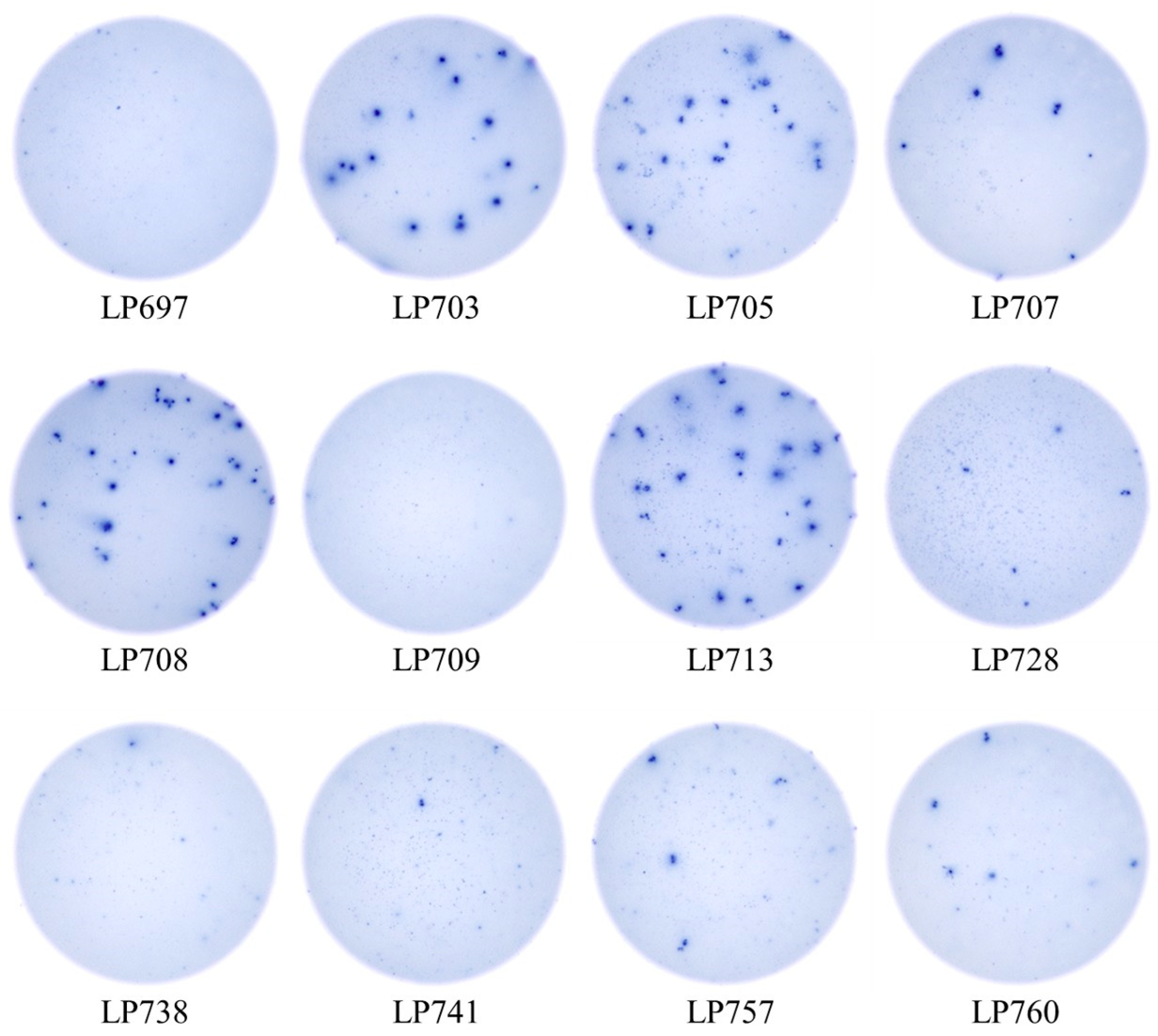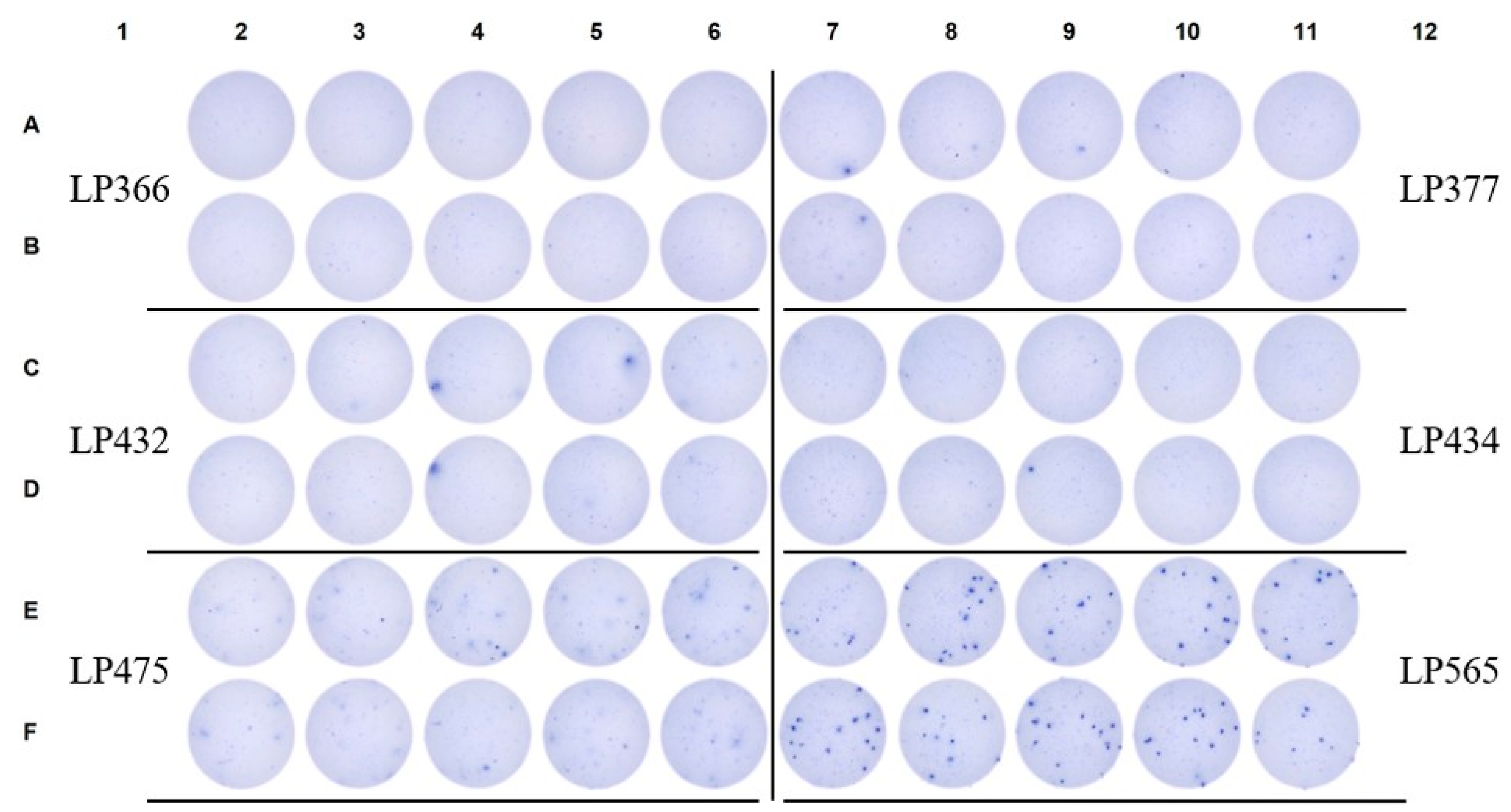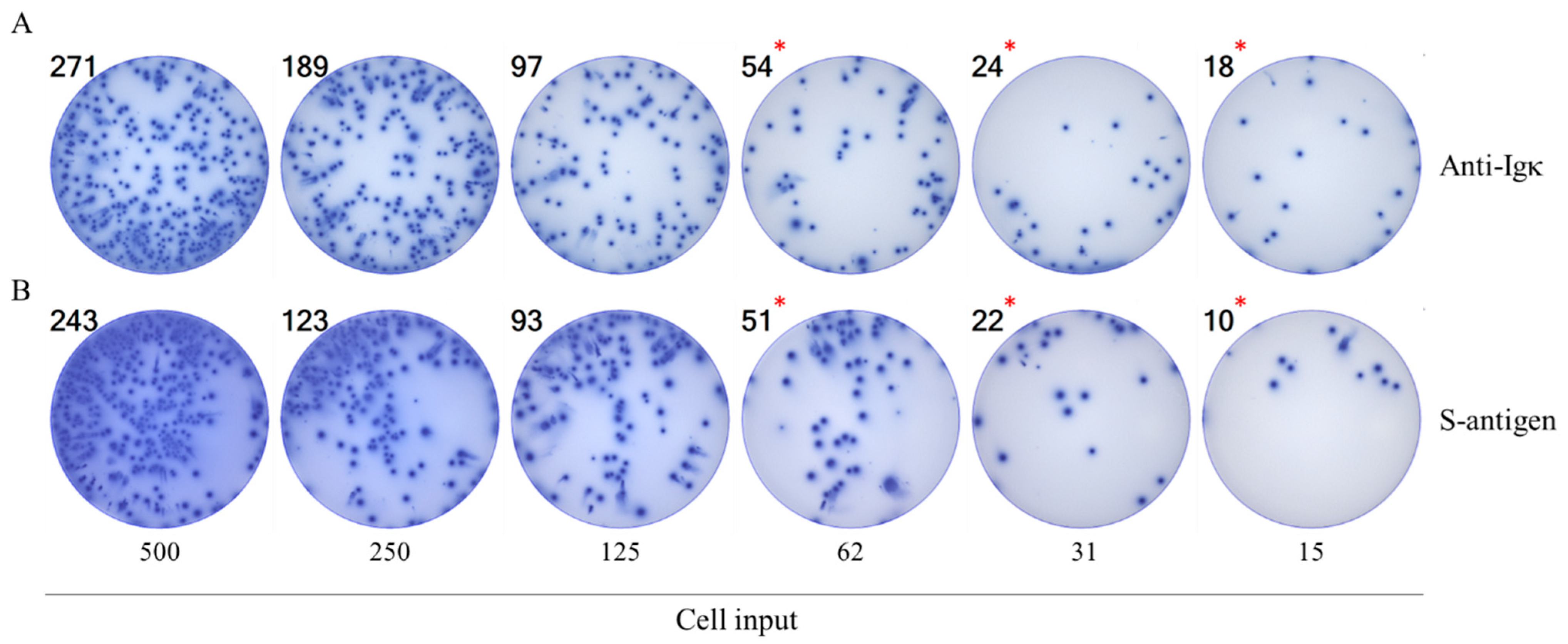 - Yao, L.; Becza, N.; Maul-Pavicic, A.; Chepke, J.; Kirchenbaum, G.A.; Lehmann, P.V. Four-Color ImmunoSpot® Assays Requiring Only 1–3 mL of Blood Permit Precise Frequency Measurements of Antigen-Specific B Cells-Secreting Immunoglobulins of All Four Classes and Subclasses. Methods Mol. Biol. 2024, 2768, 251–272. [Google Scholar]