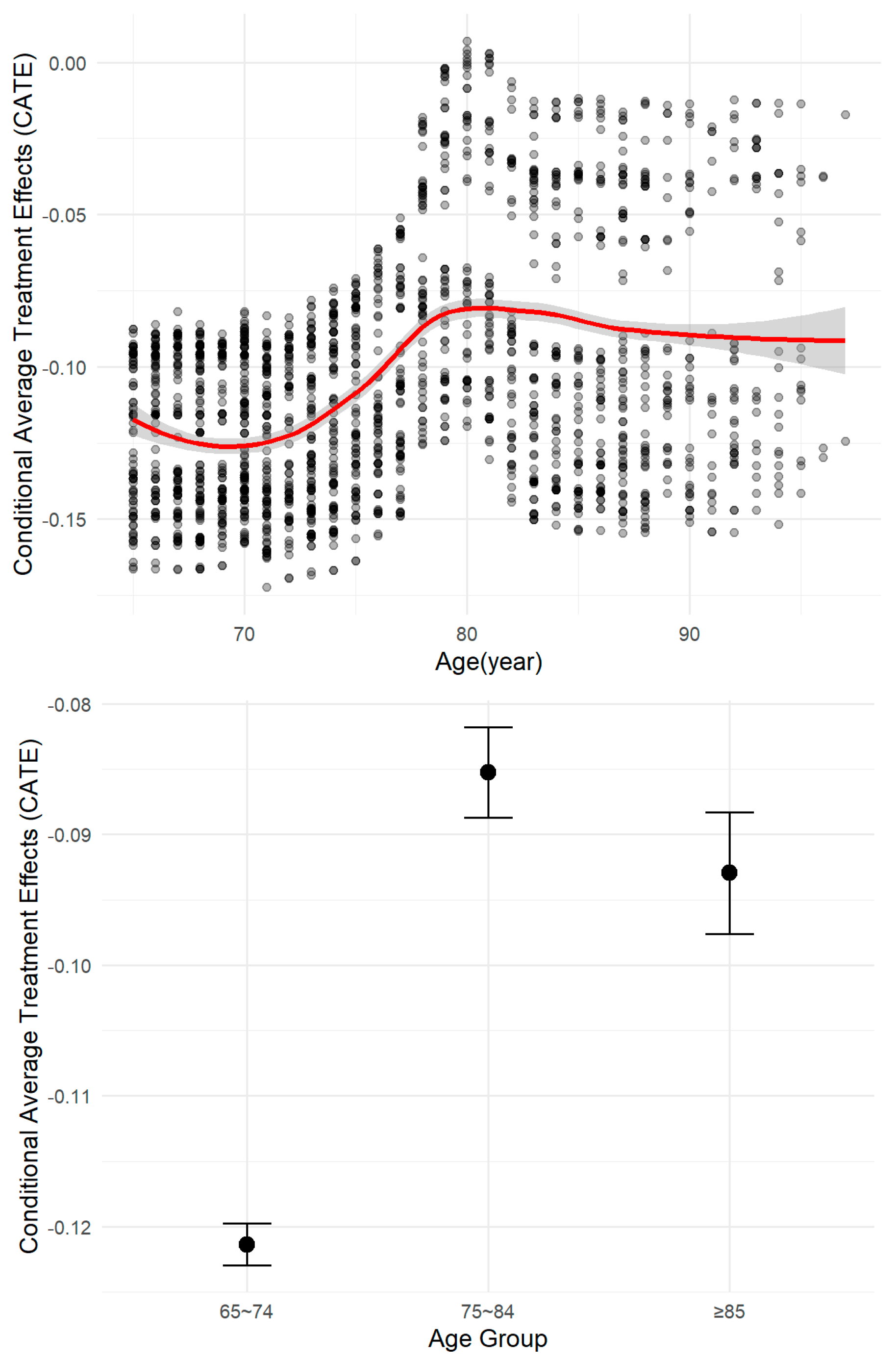 In an exploratory analysis across age subgroups, a descriptive pattern was observed in the model-derived CATE estimates. The estimate was numerically largest in patients aged 65–74 years (CATE point estimate: −0.122), with numerically smaller estimates in those aged 75–84 years (−0.088) and ≥85 years (−0.093) (