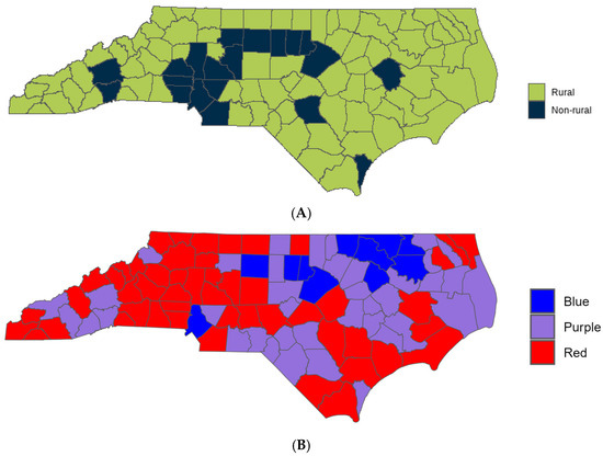 North Carolina County Map by (A) rural/non-rural and by (B) 2020 Presidential Election Result.