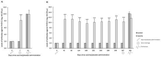 Mean (SD) levels of antibodies against rabbit hemorrhagic disease virus type 2 (RHDV2) in vaccine and control groups of studies evaluating onset of immunity (A) and duration of immunity (B) against a classical RHDV (GI.1) strain. * p < 0.05; *** p < 0.001 vs. controls.