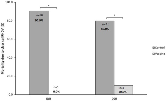 Therefore, both OOI and DOI trials showed that the mortality due to classical RHDV was statistically significantly higher (p < 0.05) in rabbits receiving the placebo than in those receiving the vaccine (Figure 8).