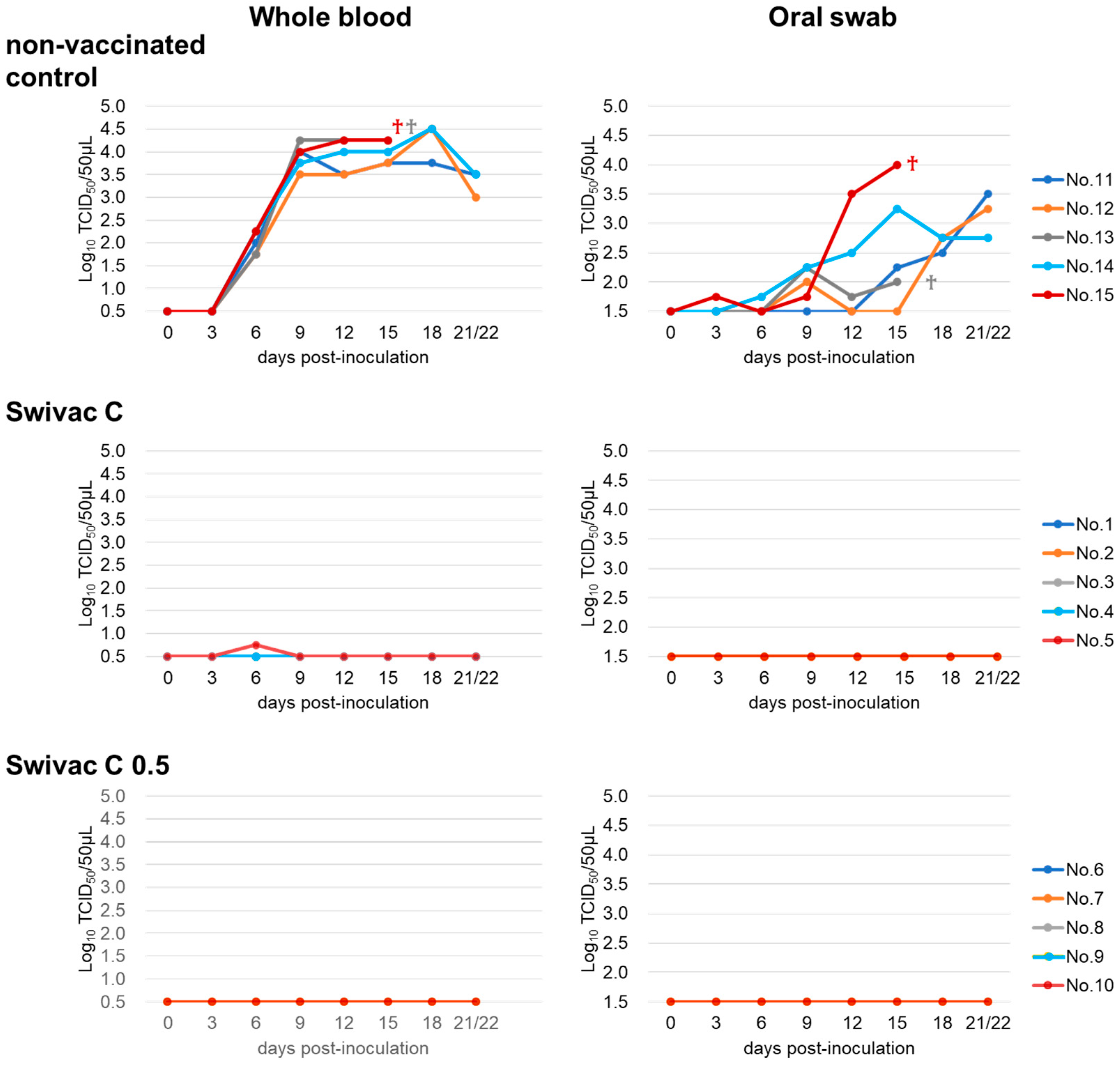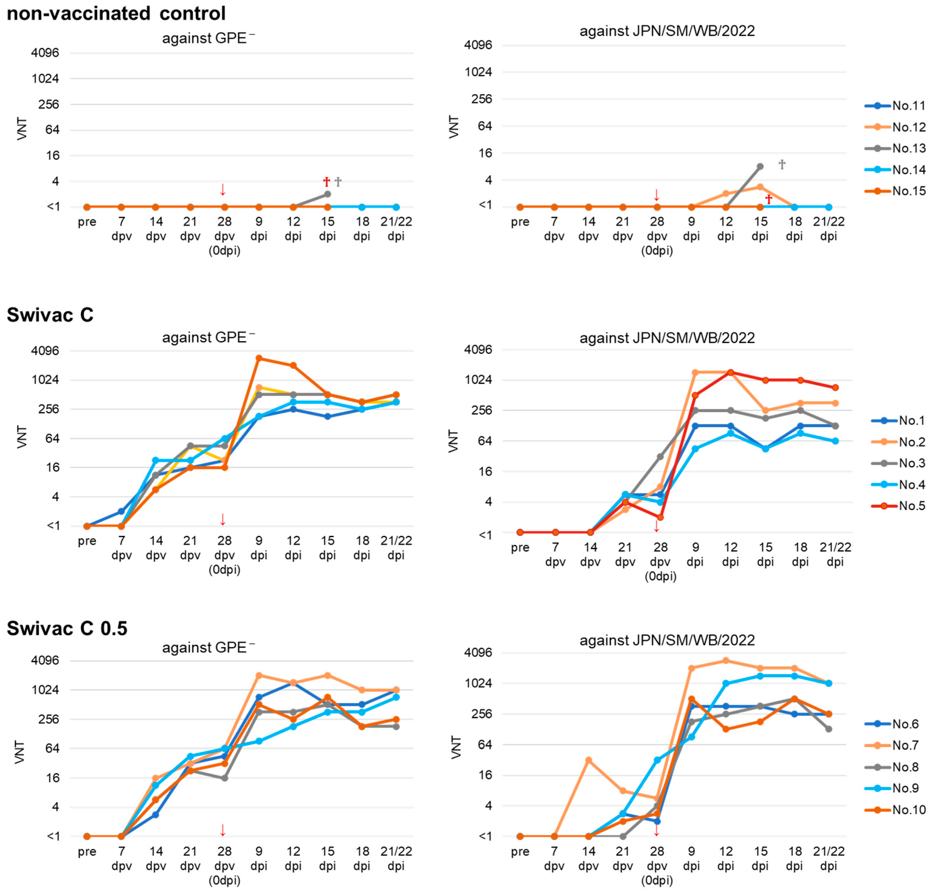 | Group 2 Swivac C 0.5-vaccinated | 6 | 21 | − | − | − | − | − | − | − | − |