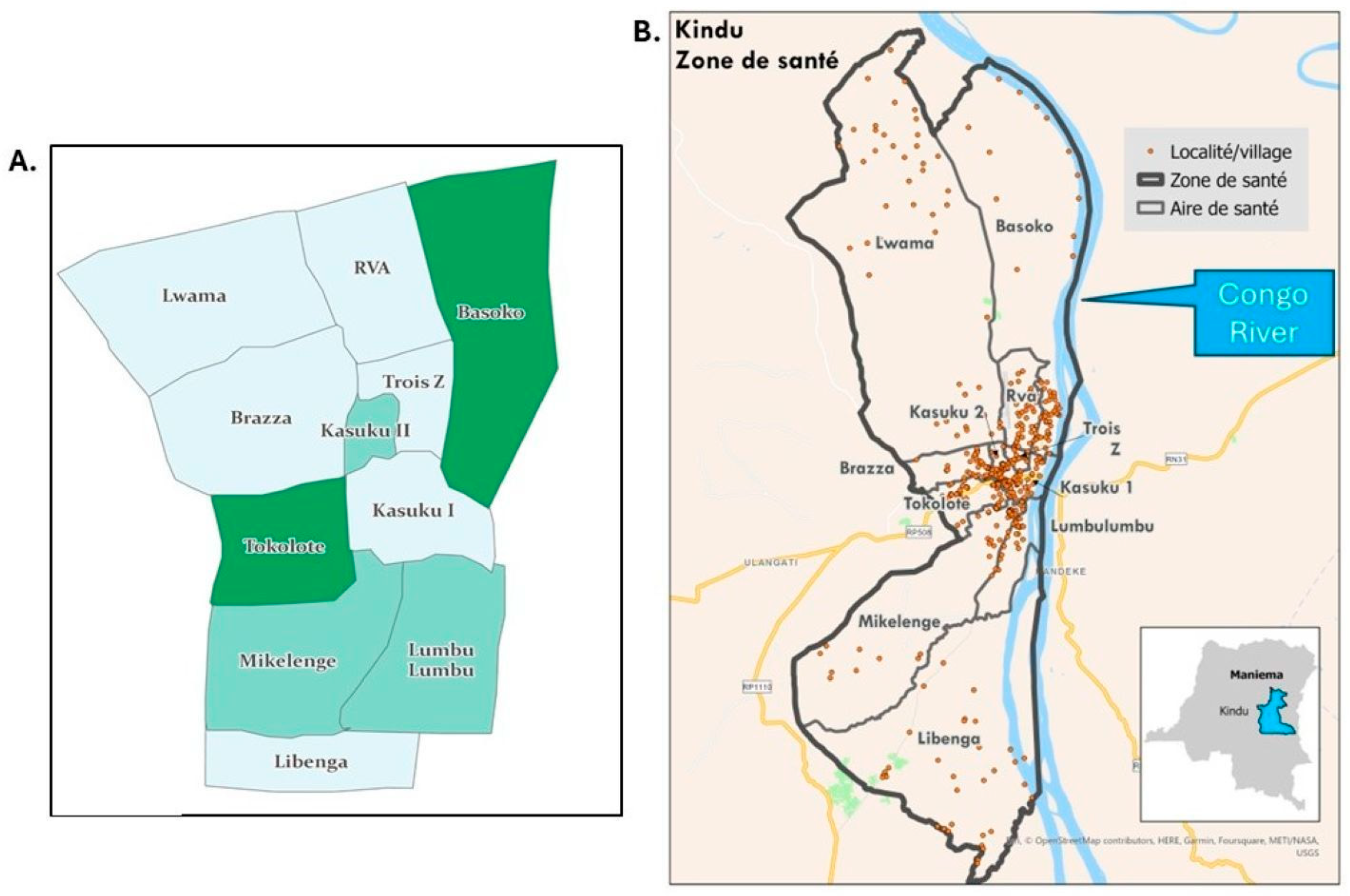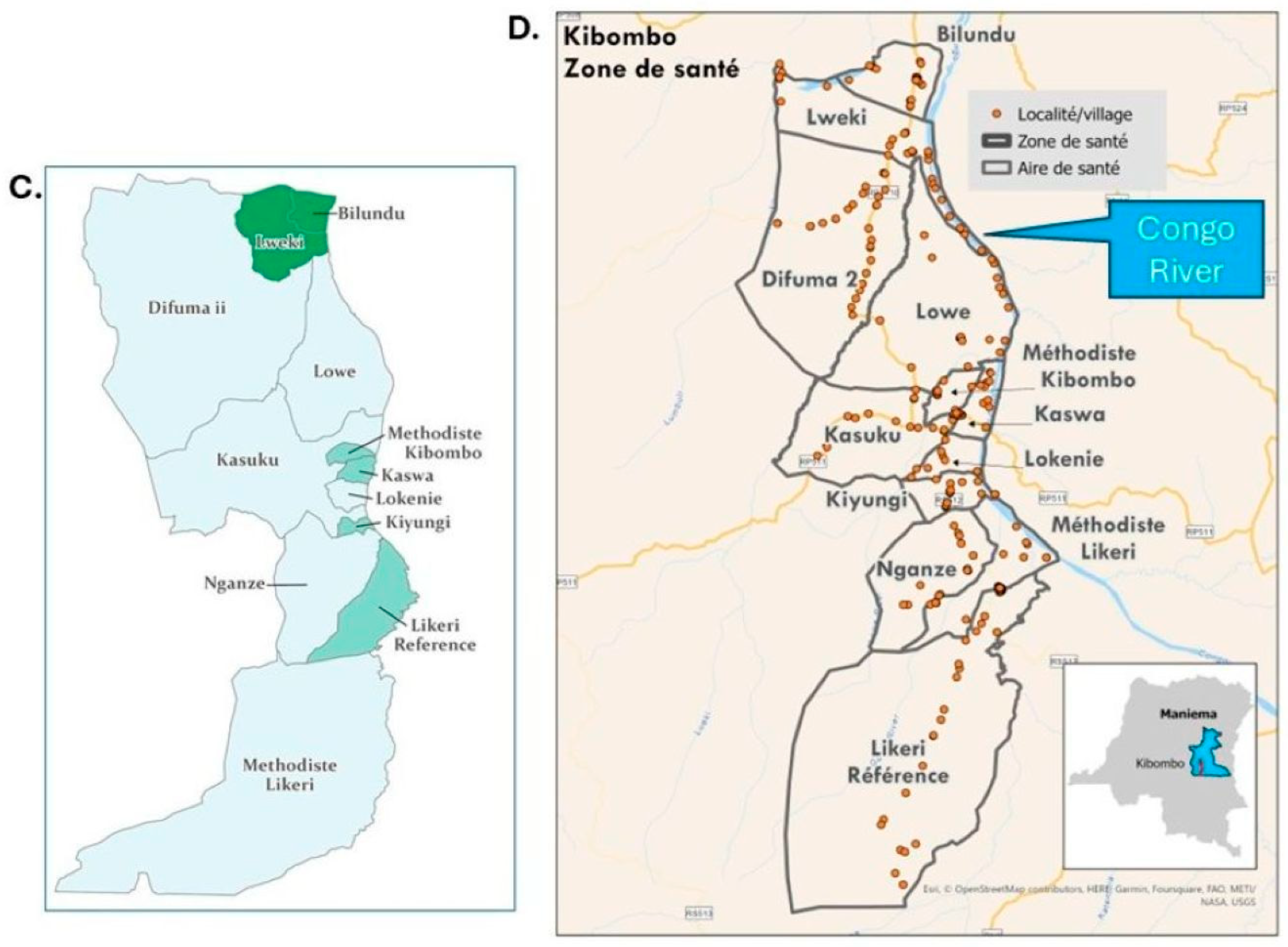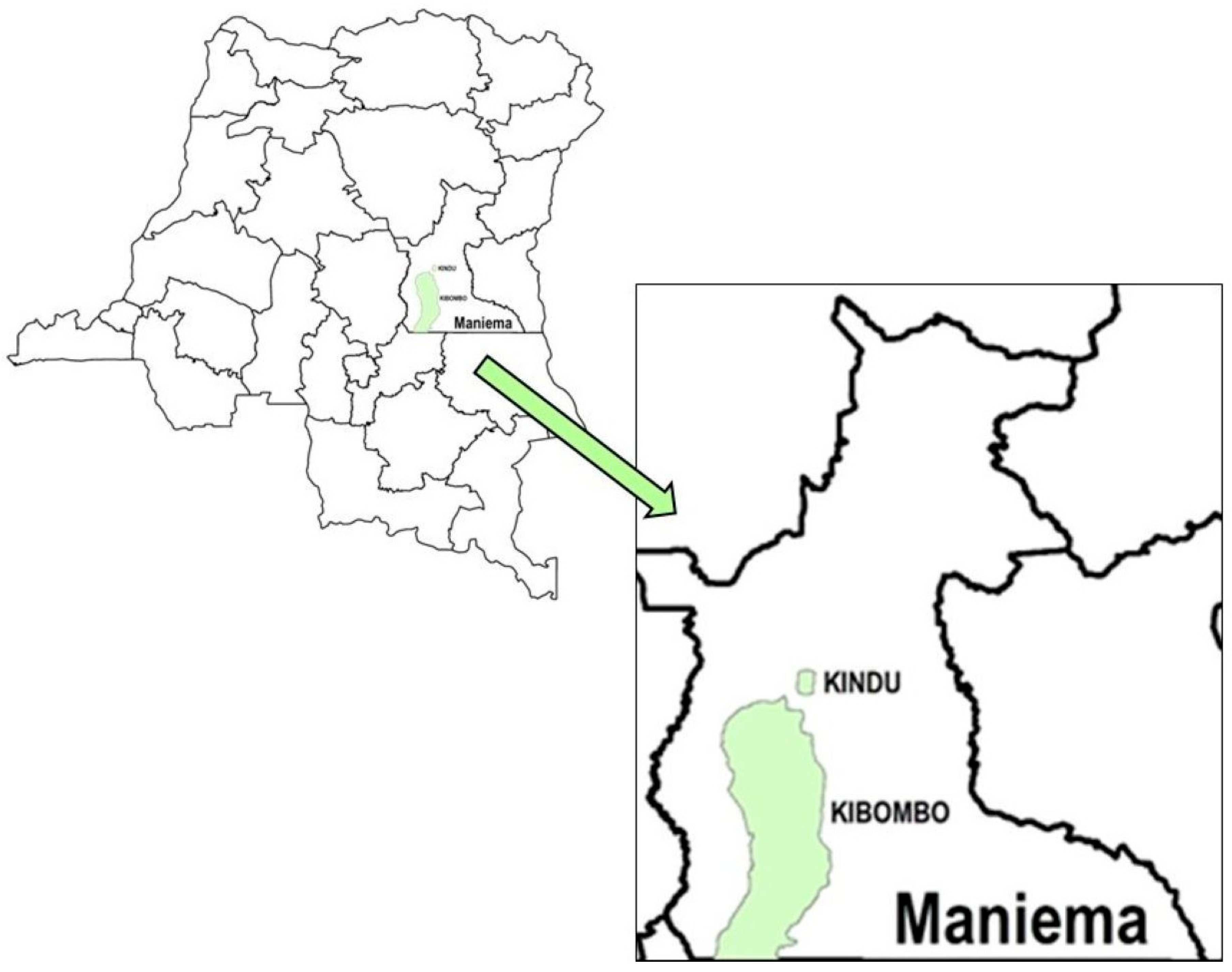 Figure 1. Map of the Democratic Republic of the Congo (left), with a guiding arrow to the inset (right) illustrating the location of Kindu and Kibombo Health Zones (in green shading) within Maniema Province.