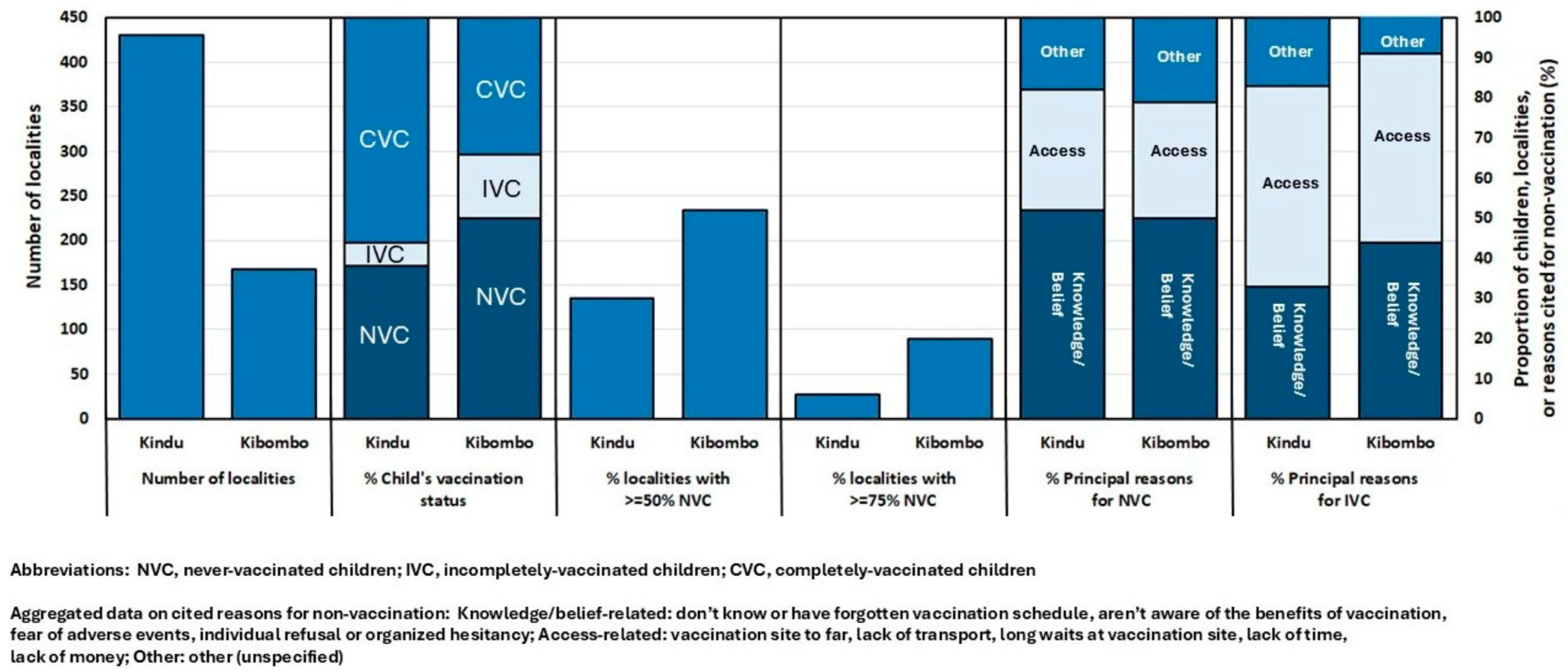 61. Ishoso, D.K.; Mafuta, E.; Danovaro-Holliday, M.C.; Ngandu, C.; Menning, L.; Cikomola, A.M.-W.; Lungayo, C.L.; Mukendi, J.-C.; Mwamba, D.; Mboussou, F.-F.; et al. Reasons for Being “Zero-Dose and Under-Vaccinated” among Children Aged 12–23 Months in the Democratic Republic of the Congo. Vaccines 2023, 11, 1370. [Google Scholar] [CrossRef]