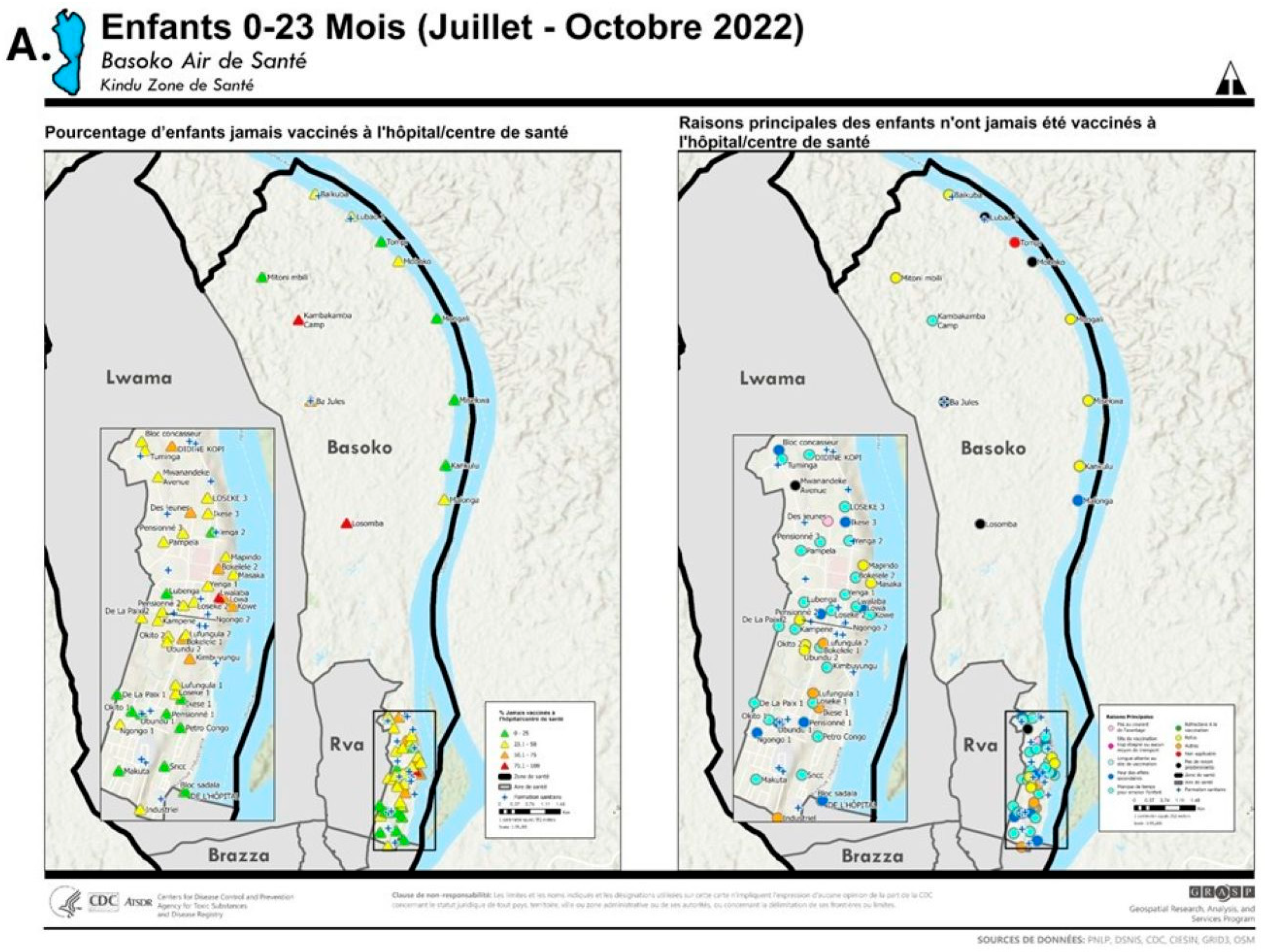 Figure 4. Kindu and Kibombo Health Zones, Maniema Province, Democratic Republic of the Congo: Summary of enumeration of children aged 0–23 months with vaccination status, principal reasons for non-vaccination, and participatory mapping, July–October 2022.