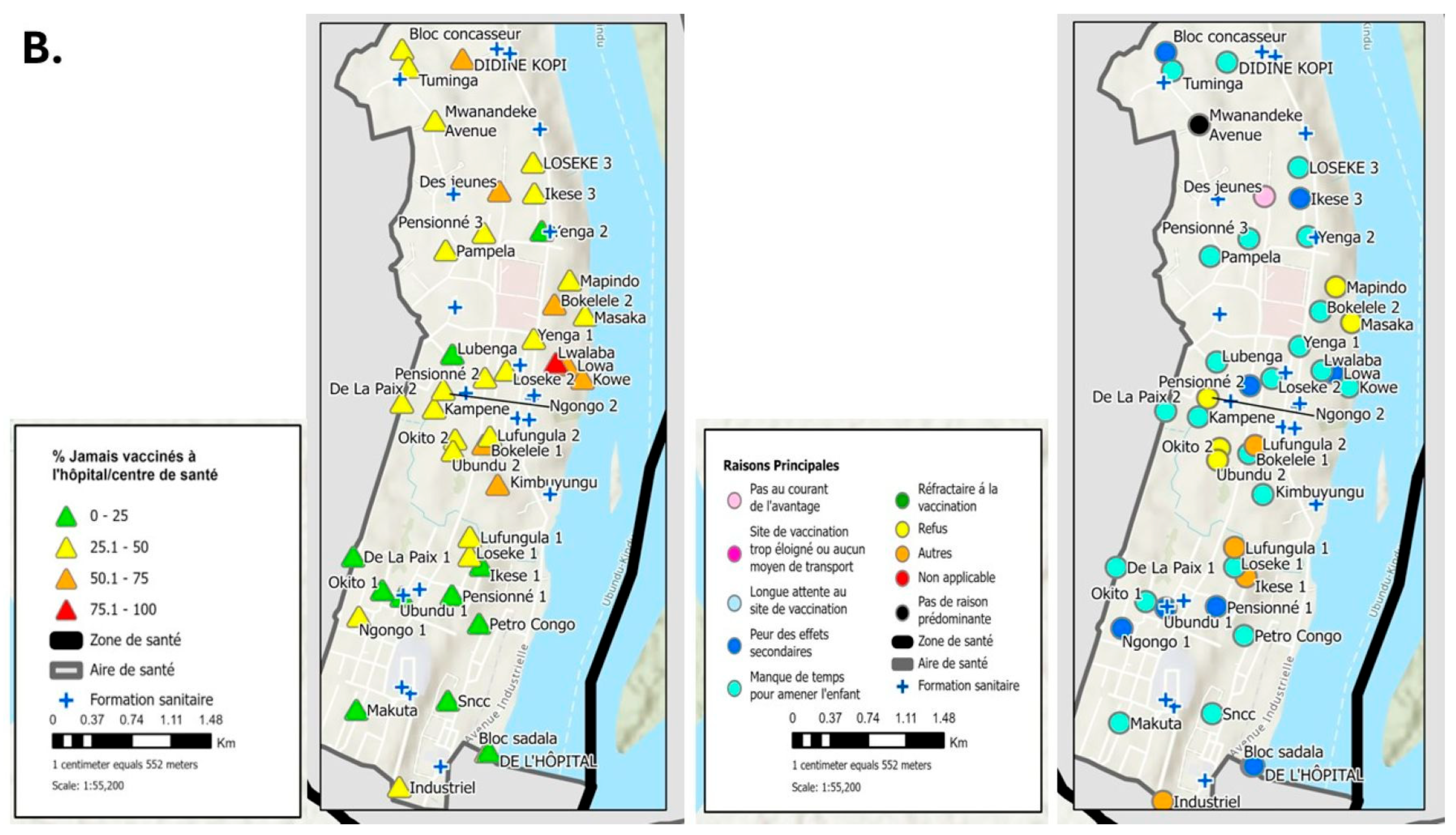 Figure 5. (A) Basoko Health Area (HA, Aire de santé), Kindu Health Zone (Zone de santé), Maniema Province, Democratic Republic of the Congo, is an example of a combination map provided to HA staff that illustrates, by locality, the proportion of children aged 0–23 months who were never vaccinated in a hospital or health center (left) and the principal reasons for never vaccination as reported by caretakers (right), 2022. The proportions of children, by locality, who were never vaccinated are presented with colored triangles as follows: green, 0–25%; yellow, 25.1–50%; orange, 50.1–75%, and red, 75.1–100%. The principal reasons for never vaccination, by locality, are presented with colored circles as follows: light pink, not aware of the benefits; dark pink, vaccination site is too far or no means of transport; light blue, long waits at the vaccination site; dark blue, fear of adverse events; aqua, lack of time to bring the child; dark green, organized refusal to vaccinate; yellow, individual refusal to vaccinate; orange, other; red, not applicable; black, no predominant reason. The blue crosses represent the location of health facilities. These legends are the same for Tools S17–S21. (B) Magnified insets from maps in Figure 5A.