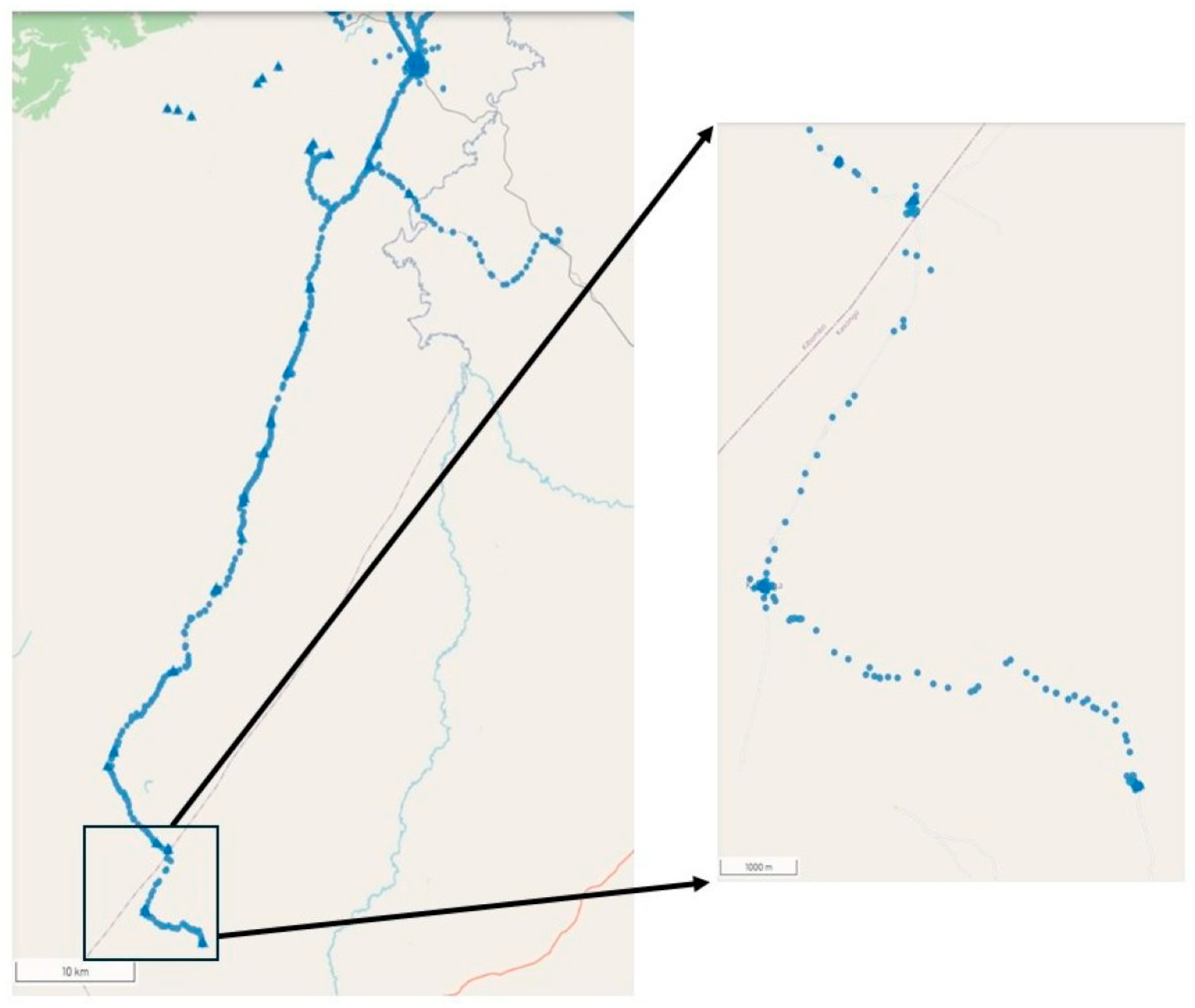 Figure 7. Likeri Reference Health Area (HA), Kibombo Health Zone, Maniema Province, Democratic Republic of the Congo: Geographic tracking of vaccination teams conducting vaccination throughout the HA on a given day during the second of three PIRIs, December 2023 (left panel, scale = 10 km). The blue dots represent moments when geographic location data were recorded on the smartphones carried by vaccination teams and the blue triangles represent when and where those teams entered vaccination session-related data into the smartphones. The right panel inset (scale = 1000 m) is a magnified view of the southernmost region of the HA.