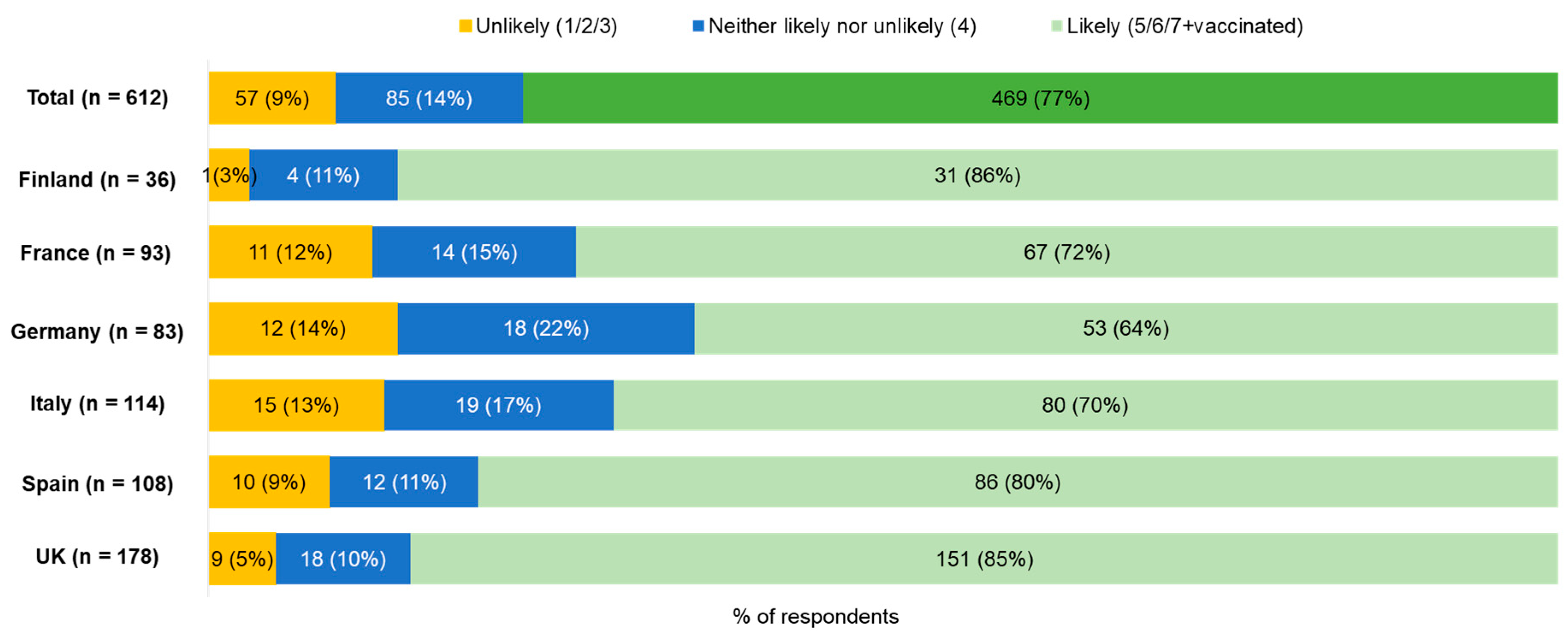 | Total (n = 740) | Finland (n = 47) | France (n = 116) | Germany (n = 100) | Italy (n = 144) | Spain (n = 126) | UK (n = 207) | |