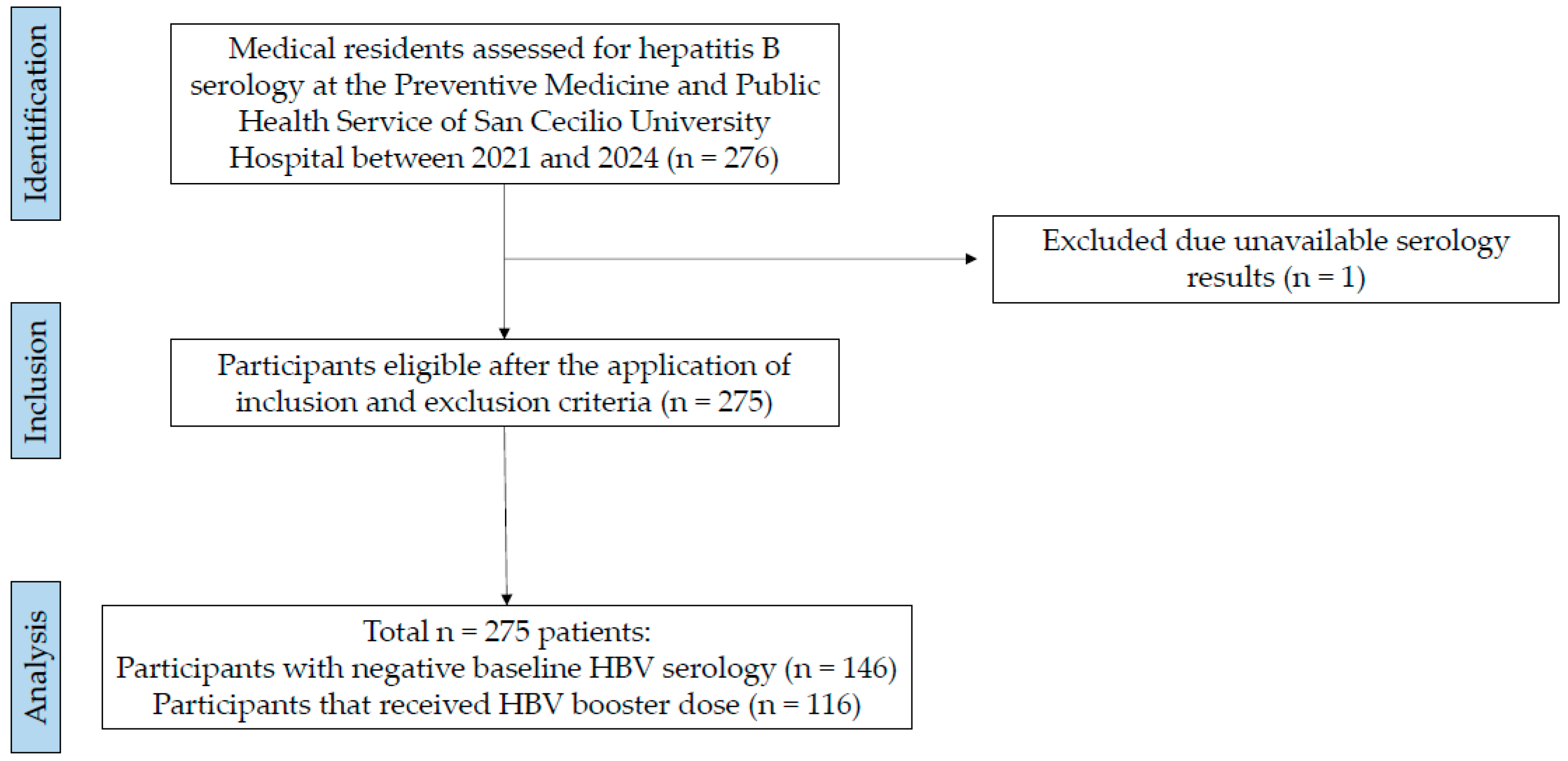 Chicago/Turabian StyleSalguero-Cano, Victoria, Silvia Martínez-Martínez, Manuel González-Alcaide, Carmen Valero-Ubierna, Virginia Martínez-Ruiz, Mario Rivera-Izquierdo, and Inmaculada Guerrero-Fernández de Alba. 2026. "Baseline Hepatitis B Immunity and Vaccination Booster Response Among Medical Residents: A Longitudinal Study in a Spanish Tertiary Hospital" Vaccines 14, no. 3: 280. https://doi.org/10.3390/vaccines14030280