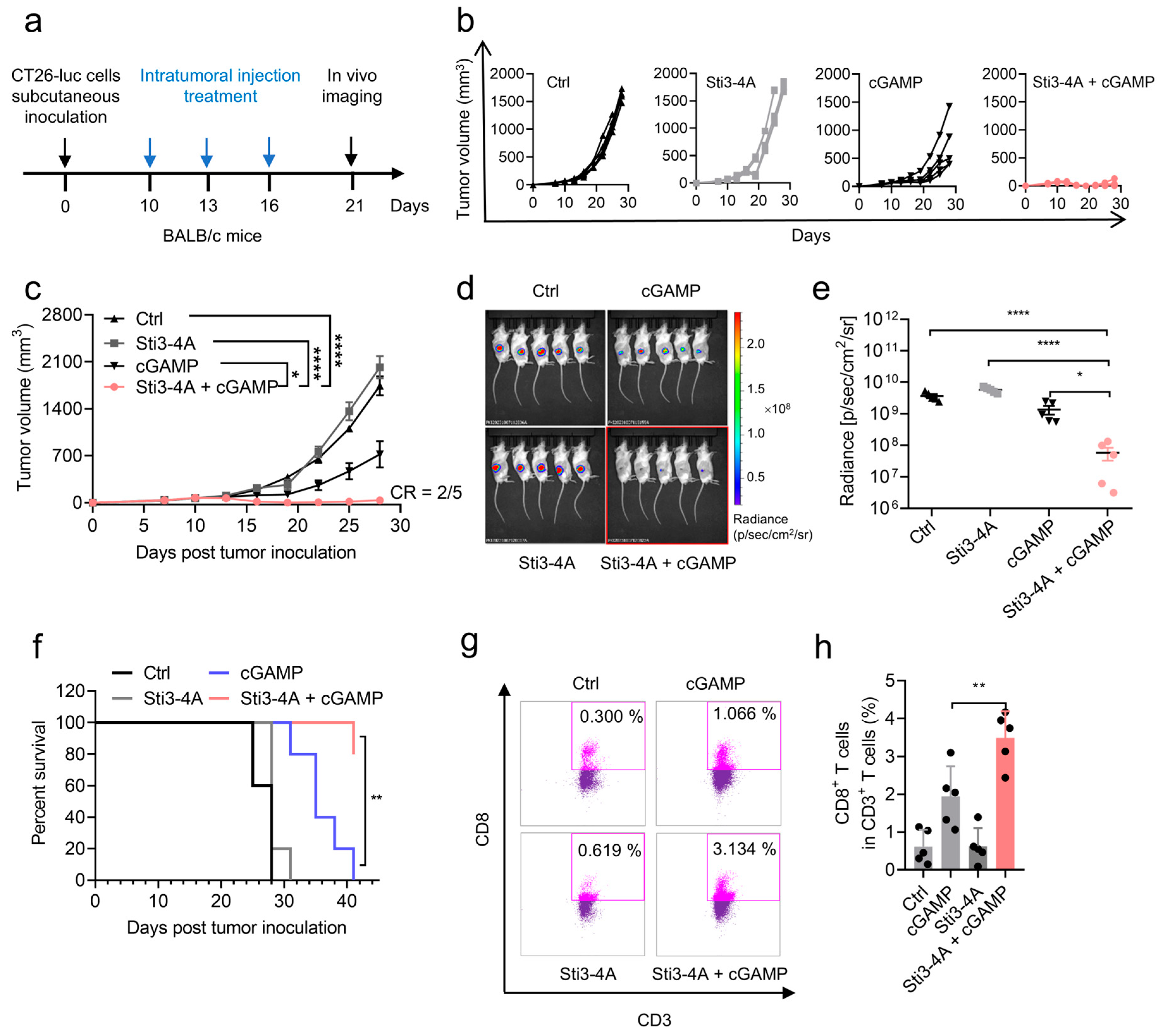 3.3. Sti3-4A Enhances Antitumor Efficacy of cGAMP In Vivo