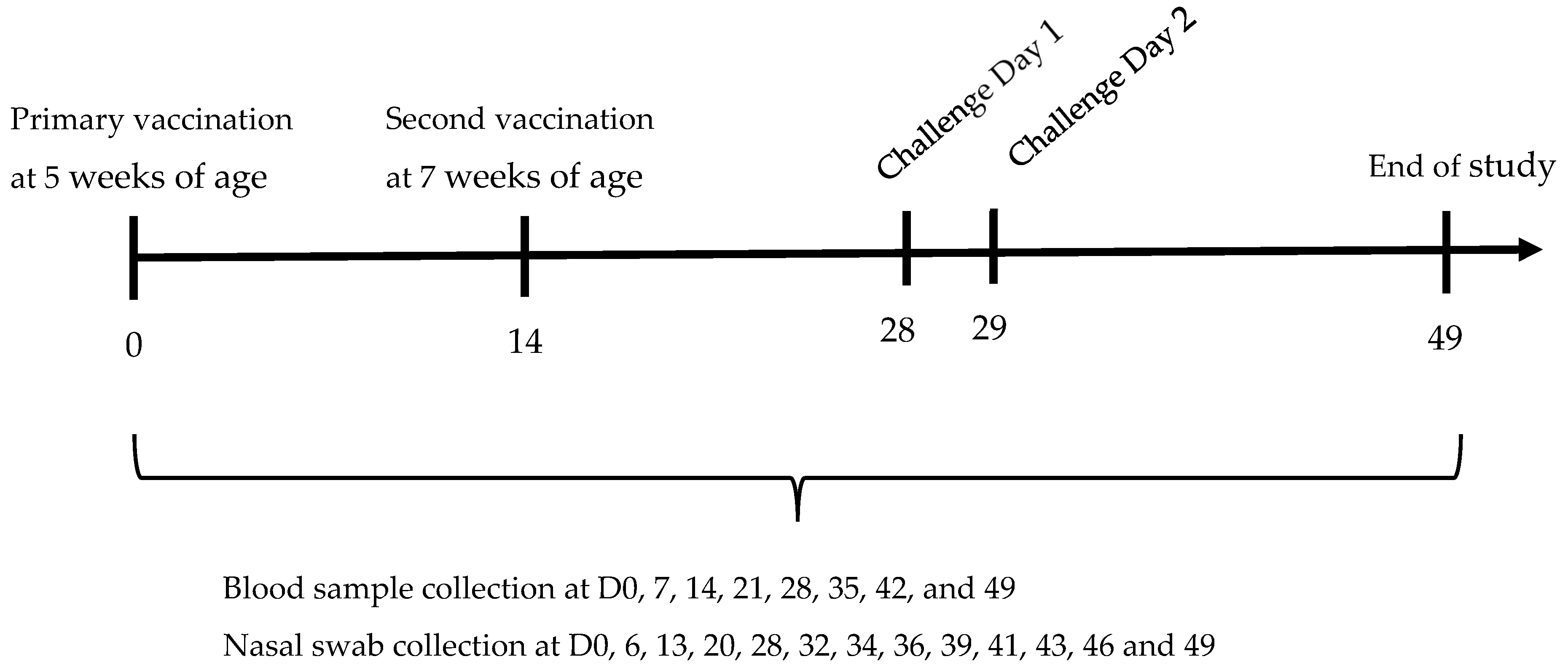B. bronchiseptica two weeks after the second vaccination (days 28 and 29). Daily clinical observations were carried out for three weeks post-challenge until the end of the study on day 49. Blood samples were collected from all dogs on days 0, 7, 14, 21 and 28 to determine serological response to vaccination by ELISA and on days 35, 42 and 49 to determine the serological response to challenge. Nasal swabs were collected from all dogs on days 0, 6, 13, 20, and 28 to confirm the pre- and post-vaccination shedding status and on days 32, 34, 36, 39, 41, 43, 46 and 49 to determine relative excretion post-challenge. A schematic representation of the study design is shown in