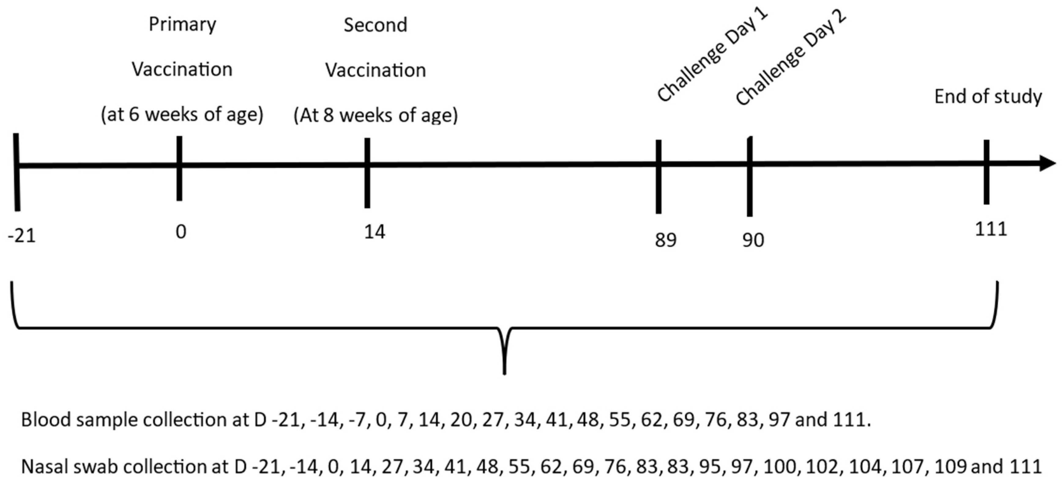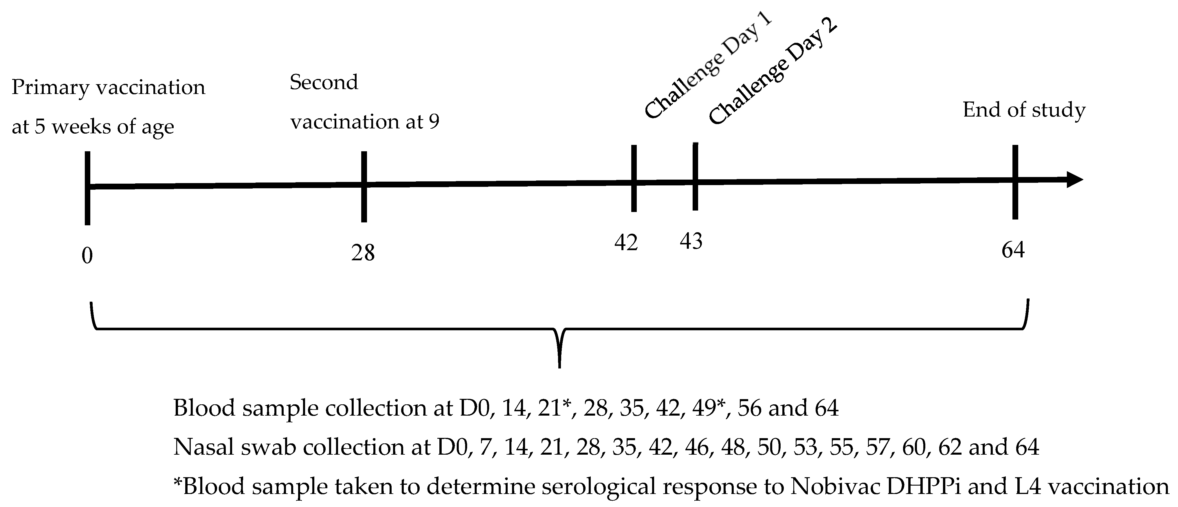 B. bronchiseptica (day 42). Daily clinical observations were carried out for three weeks post-challenge until the end of the study on day 64. Blood samples were taken from all dogs on days 0, 7, 14, 21, 28, 35, 42, 49, 56 and 64 to determine serological response to vaccination and challenge. Nasal swabs were collected from all dogs on days 0, 7, 14, 21, 28, 35, and 42 to confirm the pre- and post-vaccination shedding status and on days 46, 48, 50, 53, 55, 57, 60, 62 and 64 to determine relative excretion post-challenge. A schematic representation of the study design is shown in