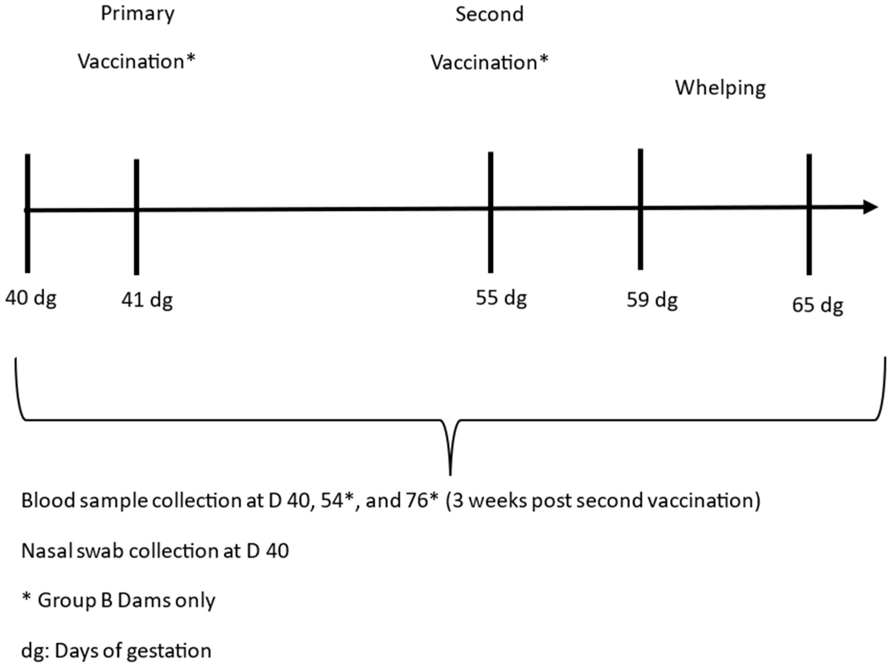 Four pregnant adult Beagle dams were split equally into two groups: A (unvaccinated controls) and B (vaccinated). The group B dogs were vaccinated subcutaneously with Nobivac Respira Bb at a minimum antigen potency of 86 U per dose (selected to ensure duration of immunity extended beyond that of peak immunity) on day 41 of gestation, followed by a second vaccination on day 55 of gestation. Blood was collected from the group A and B dams on day 40 of gestation, and additionally from group B on day 54 of gestation, and at 3 weeks post-second vaccination (day 76) to determine the serological response to vaccination. Nasal swabs were collected from both groups A and B on day 40 of gestation. A schematic representation of the study design is shown in
