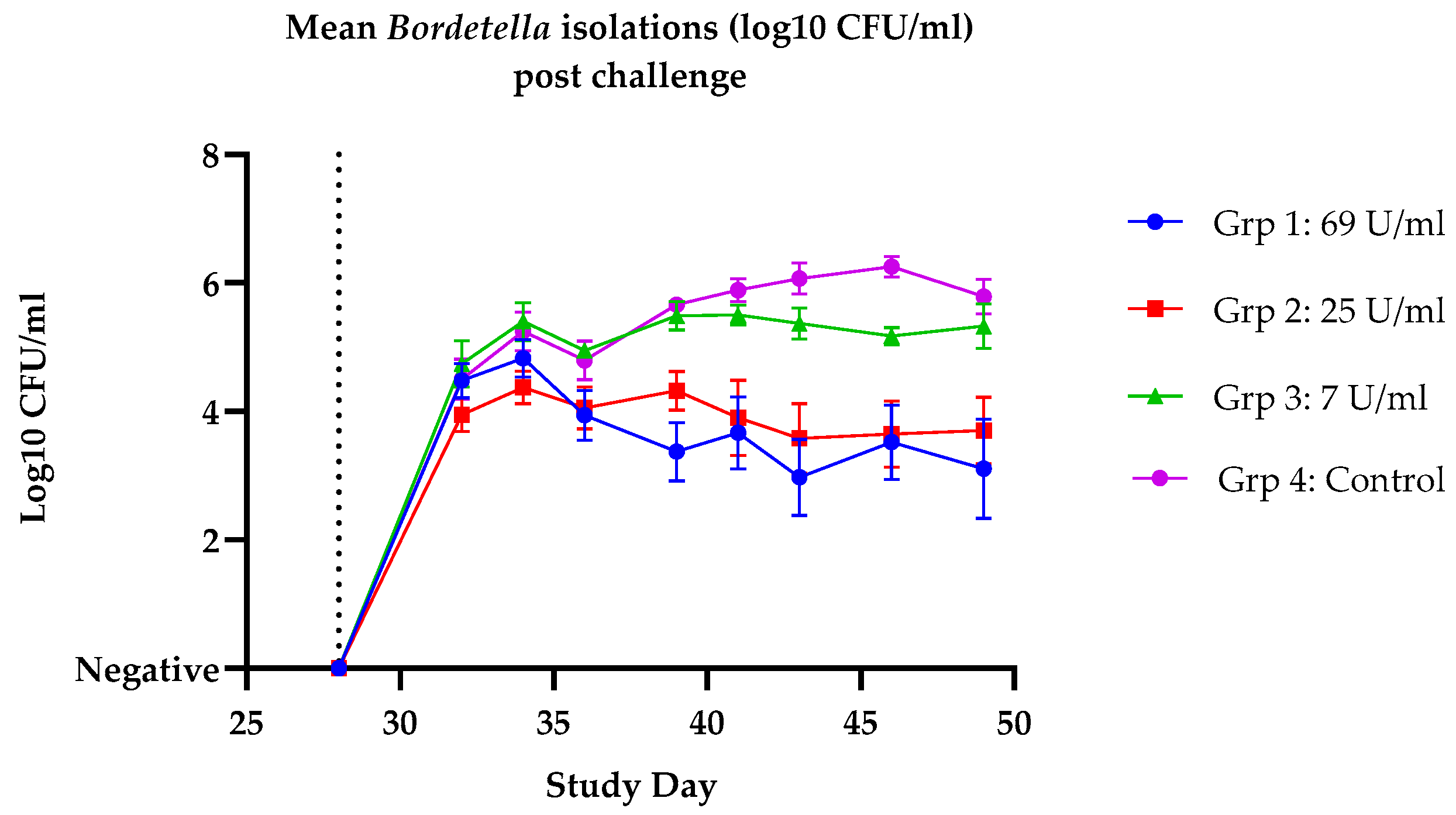 B. bronchiseptica at 19 weeks of age when the MDA levels in group 3 were no longer detectable. Daily clinical observations were made for three weeks post-challenge until the end of the study on day 111. Blood samples were collected from all groups of puppies on days −21, −14, −7, 0, 7, 14, 20, 27, 34, 41, 48, 55, 62, 69, 76, 83, 97 and 111 to determine the serological status. Nasal swabs were collected from the pups on days −21, −14, 0, 14, 27, 34, 41, 48, 55, 62, 69, 76, 83, 83, 95, 97, 100, 102, 104, 107, 109 and 111 to determine the levels of