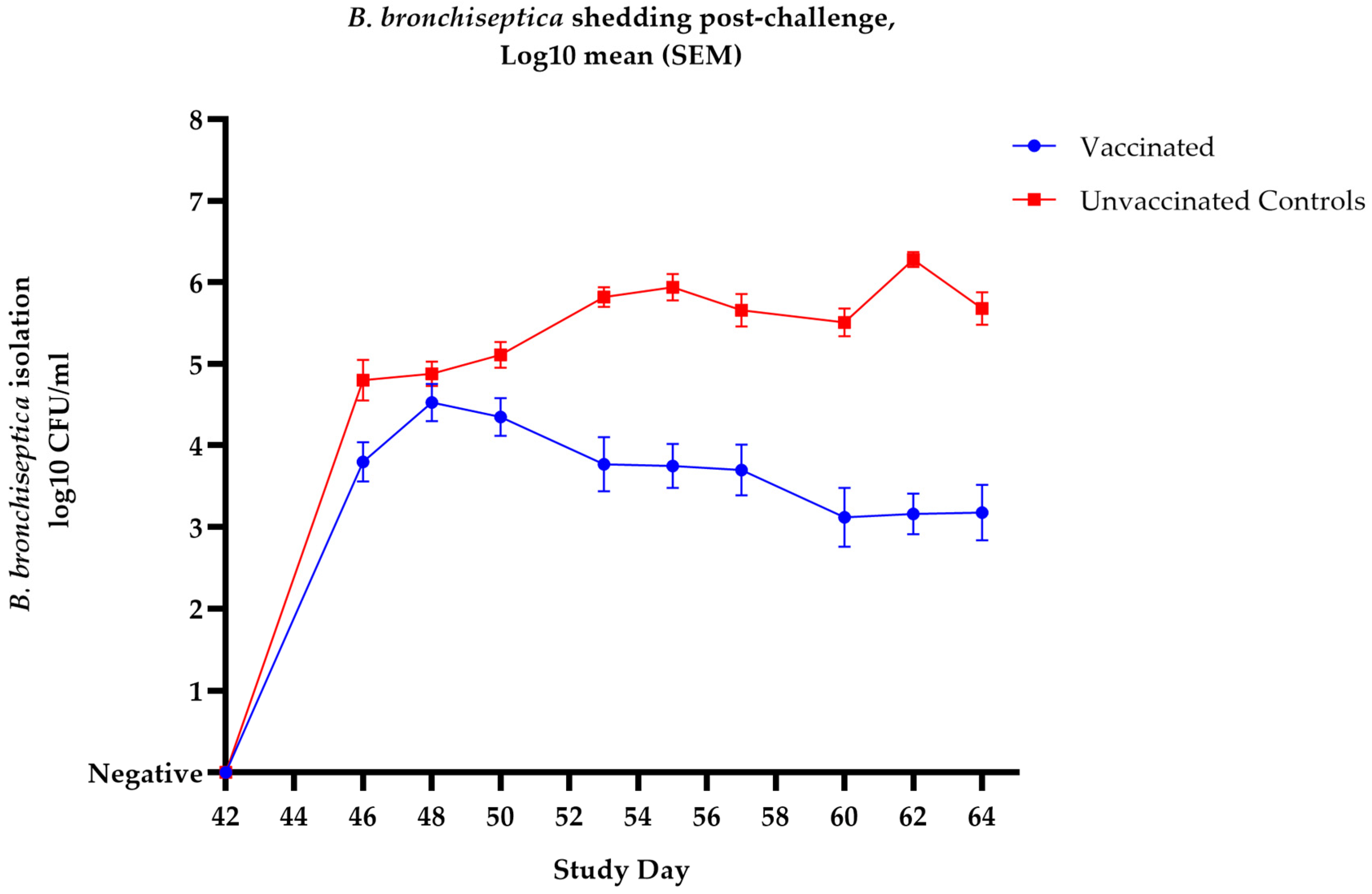 The present studies address these gaps by evaluating the safety, onset of immunity and efficacy of a novel injectable B. bronchiseptica vaccine in early life, including its performance when administered alongside core canine vaccines and in puppies with maternally derived antibodies. Using a novel and extensive purification process we prepared an extract of Bordetella bronchiseptica fimbrial antigen, which at various concentrations, when combined with a proprietary oil-in-water adjuvant based on vitamin E known to be safe in dogs (unpublished data), could induce strong immune responses in vaccinated dogs. We present a comprehensive characterisation of this novel injectable B. bronchiseptica fimbrial antigen vaccine across three complimentary studies. The doses tested all showed minimal reactions at the site of injection, with any reactions resolving in a short period as is to be expected with an oil-in-water-based vaccine. Using a dose response approach, we established a minimum dose of antigen, which was able to both give significant clinical protection and significantly reduce bacterial excretion. The onset of immunity was shown to be two weeks after the second vaccination, and whilst this is not as rapid as that following the use of intranasal vaccines, it does give the option to veterinarians to vaccinate via conventional routes concurrently with DHPPi and L4 vaccines without affecting any vaccine efficacy. Low-level antibody titres were detected in the Bordetella ELISA in the control pups, vaccinated with DHPPI +L4, alone prior to challenge. This had been seen previously and is believed to represent a low level of non-specific antibody cross reactivity in the Bordetella ELISA following DHPPi + Nobivac L4 administration. All controls remained fully susceptible and therefore immunologically naïve to Bordetella.