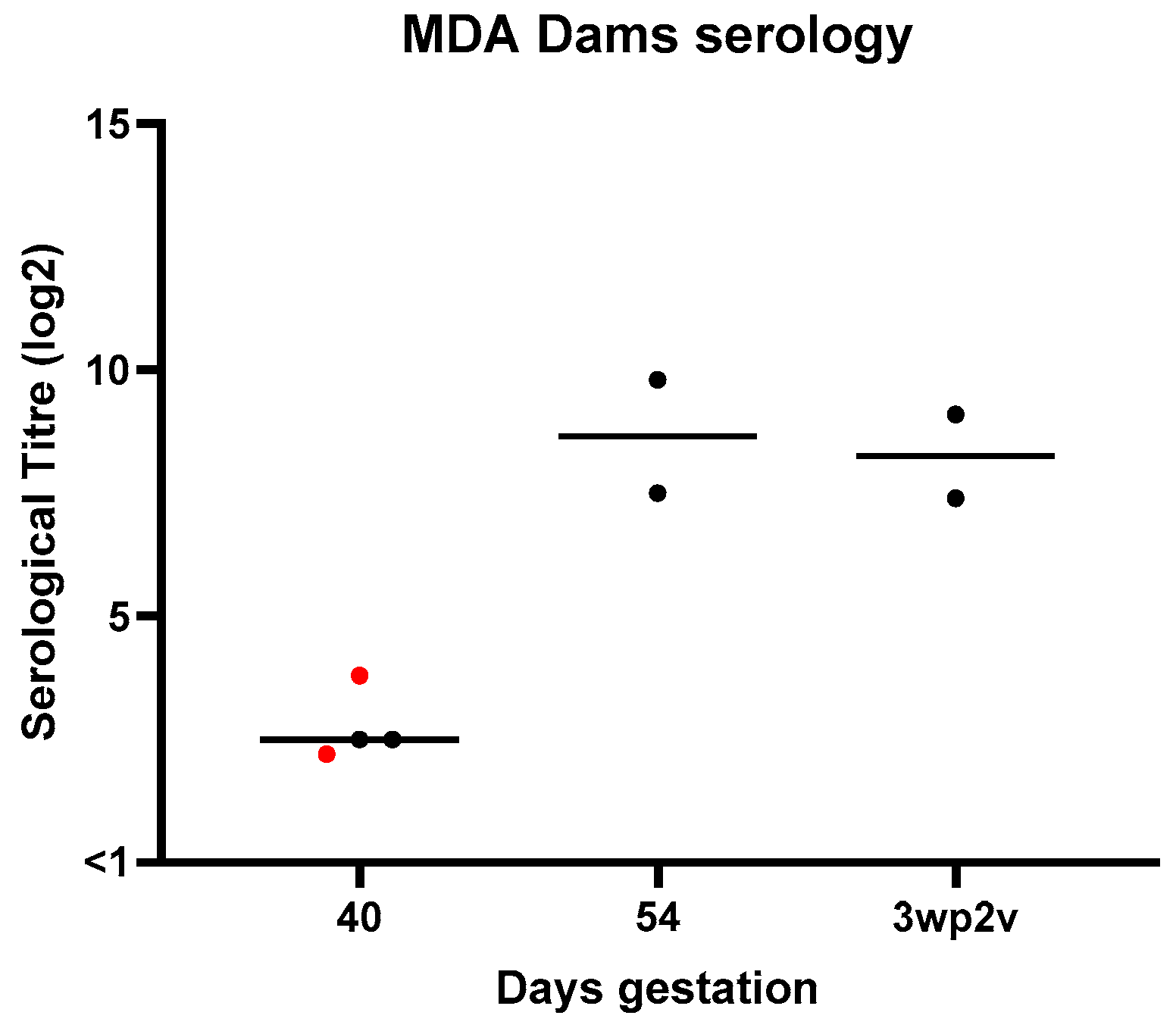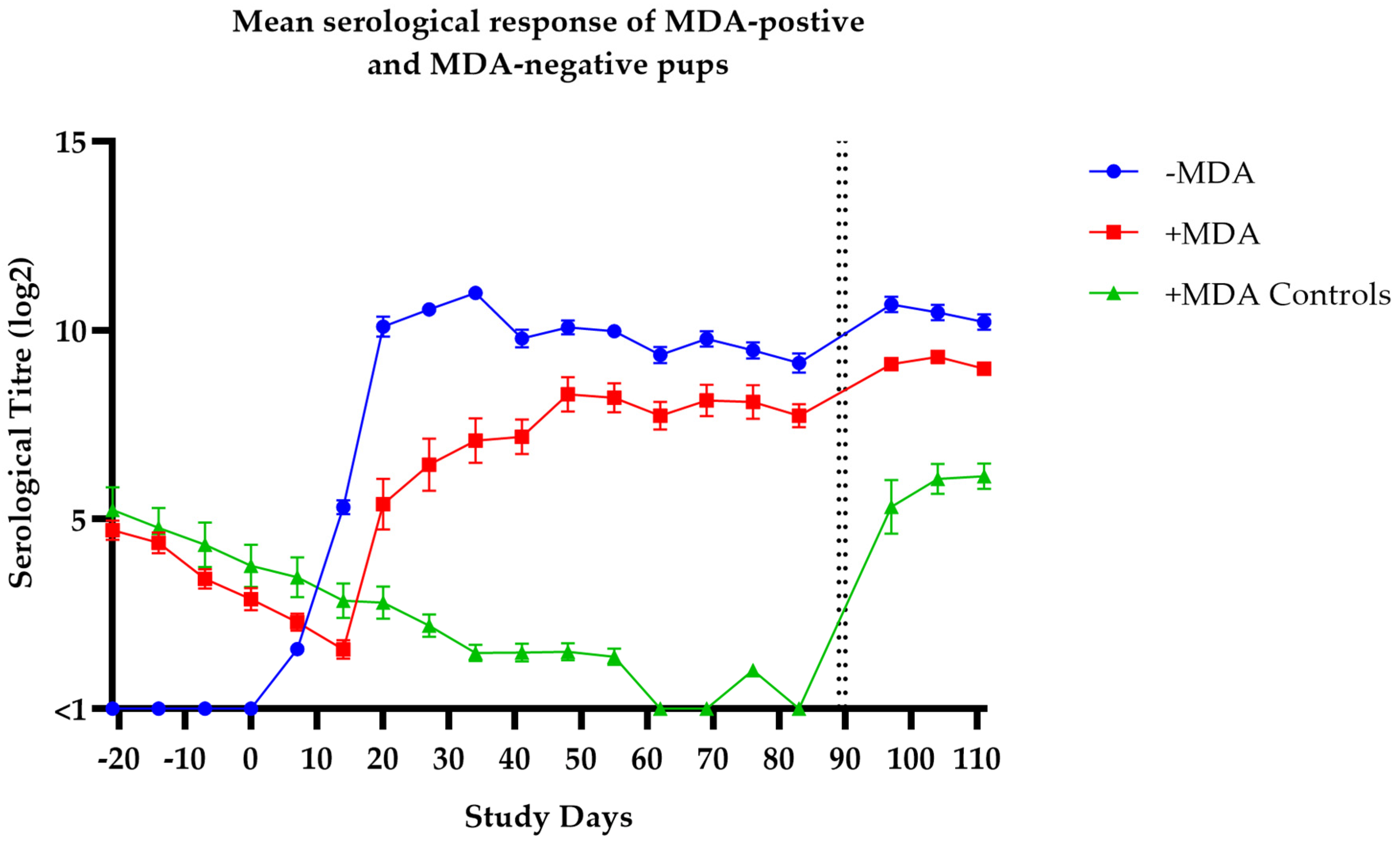 Following whelping, the puppies born to the group A and group B dams were allocated to groups based on their maternally derived antibody (MDA) status with respect to