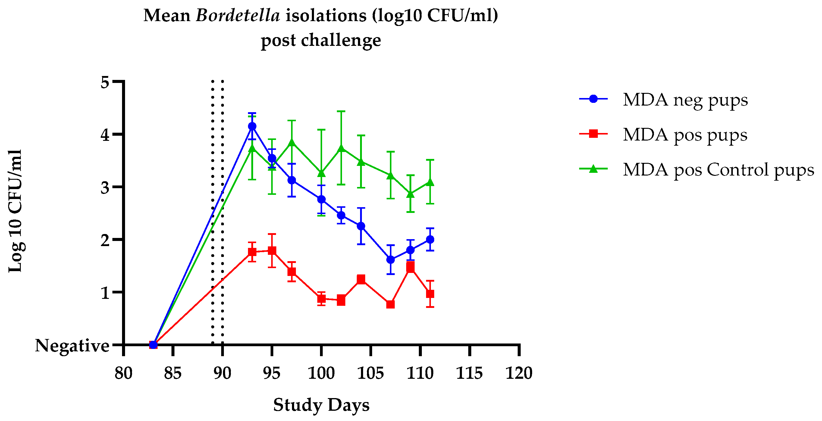 Bordetella, and their litter group. Group 1 comprised 11 pups (negative for MDAs) whelped from the group A dams; groups 2 and 3 comprised 9 and 8 pups respectively (positive for MDAs) whelped from the group B dams. All pups in group 1 (MDA−) and group 2 (MDA+) were vaccinated at 5–6 weeks of age with a minimum potency formulation of Respira Bb (86 U per dose (selected to ensure duration of immunity extended beyond that of peak immunity)) followed by a second vaccination two weeks later. The pups in group 3 (MDA+) were not vaccinated and controlled for the natural decline in MDAs over time. All puppies were challenged with