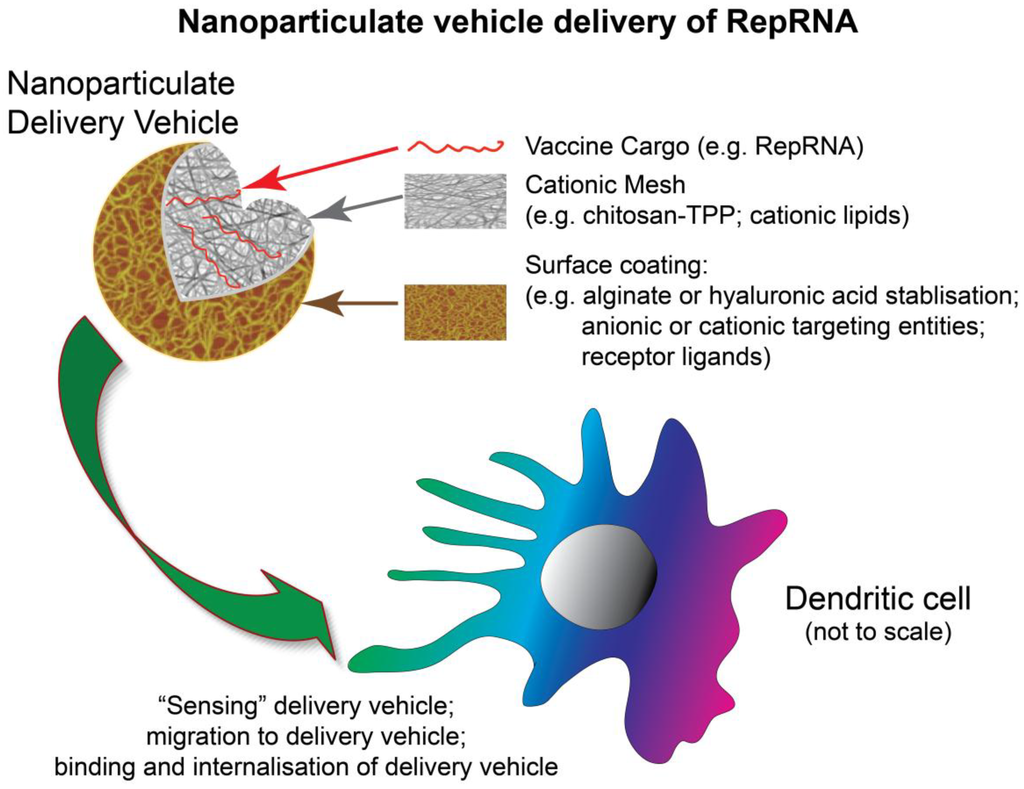 Delivery of RepRNA to DCs by nanoparticulate delivery vehicles. The delivery vehicles can be composed of polysaccharides, lipids, lipoproteins or combinations thereof. The nature of the delivery vehicle composition is to provide encapsulation of the RepRNA to protect against RNases, facilitate delivery to DCs and ensure a level of compaction enabling the RepRNA to interact with the ribosomal translation machinery. The surface of the nanoparticulate delivery vehicle may be coated to enhance stability and/or provide a means of enhance targeting of the DCs.