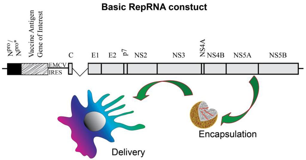 With self-amplifying RepRNA offering high potential in vaccinology due to its replicative nature [1], critical issues remain concerning the mode of delivery and interaction with DCs. Due to the problems associated with the more widely employed use of VRP delivery [6,7,8,9,10,22]—requirement for complementing cells to supply the deleted gene and thus allow VRP formation, potential species restriction, anti-VRP immunity, targeting cells other than DCs—nanoparticulate delivery vehicles offer a potentially successful alternative. It is also important to consider the nature of the RepRNA, which will relate back to the parent virus from which it as derived. The widely studied cytopathogenic alphavirus replicon vaccines [6,7,8,10] rapidly kill host cells. This in turn would pose problems for DCs, considering their characteristics of slow processing and retention of antigen for prolonged interaction with the adaptive immune system. Non-cytopathogenic replicons from flaviviruses [7,9] and pestiviruses such as CSFV [22] (Figure 2) are more in line with such DC characteristics.