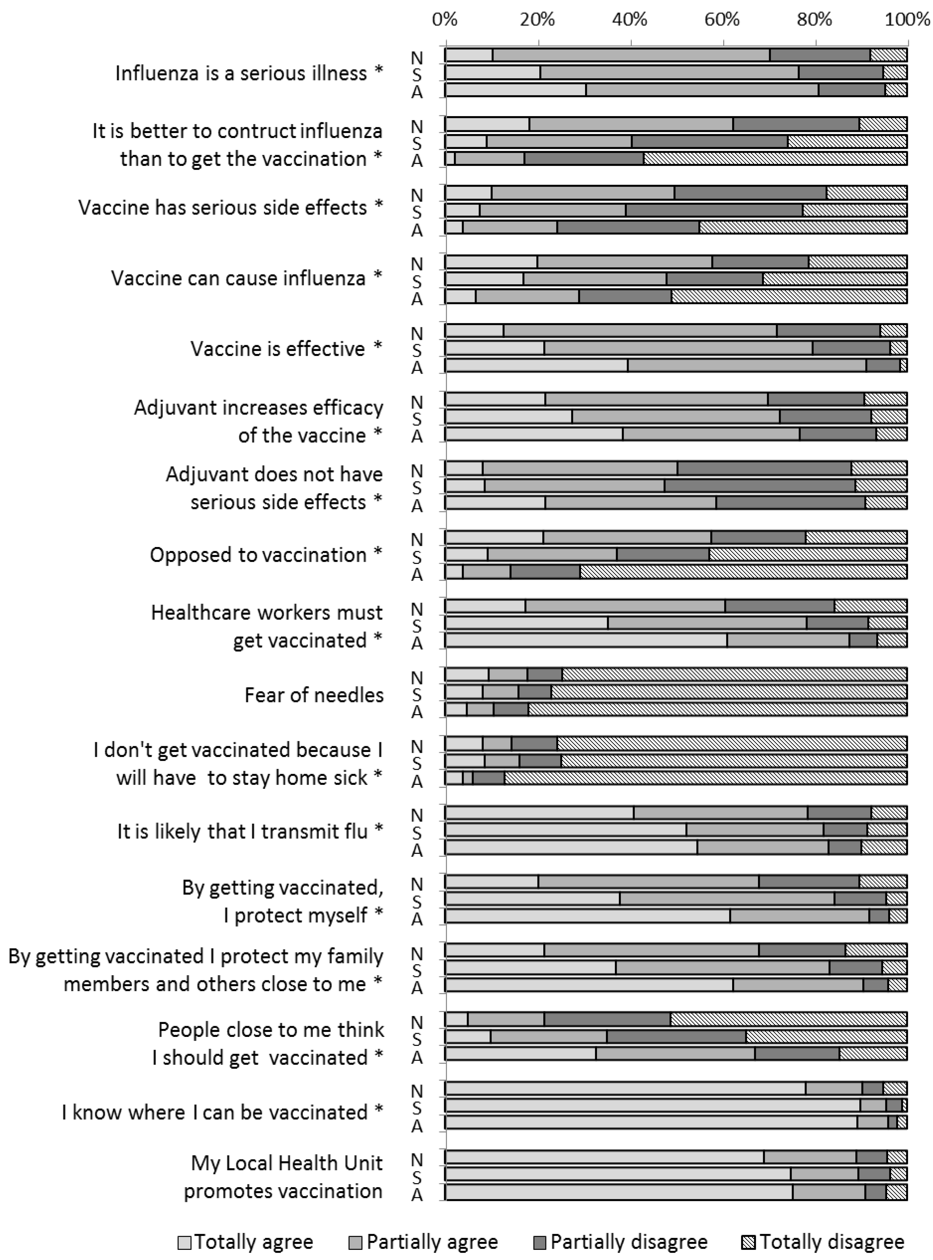 Agreement or disagreement with factual statements regarding influenza, influenza vaccination, and vaccines in the “never vaccinated” (N), “sometimes vaccinated” (S), and “always vaccinated” (A) subgroups. * p < 0.05.