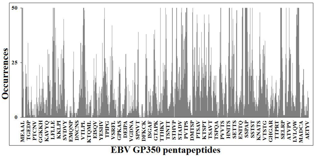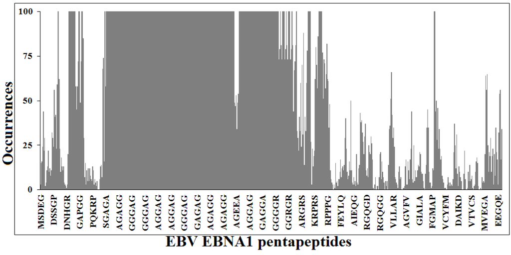 Figure 1 illustrates the similarity profile of EBV EBNA1 protein sequence to the human proteome at the pentapeptide level. It can be seen that the most part of the 637 pentapeptides that sequentially form the viral protein, are repeatedly present in human proteins. Namely, 622 out of 637 viral pentapeptides are present 66,052 times (including multiple occurrences) in 7312 human proteins [56].