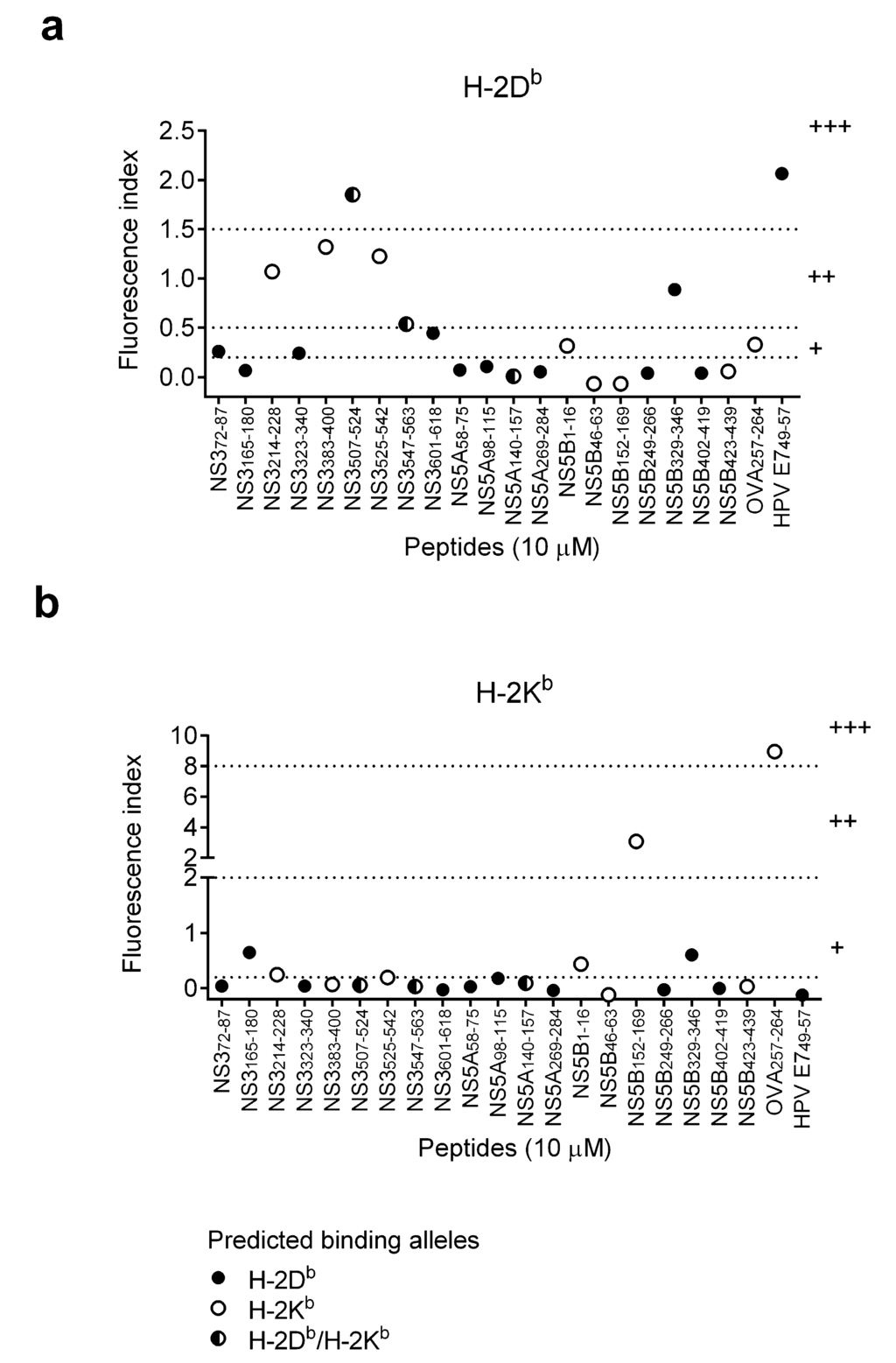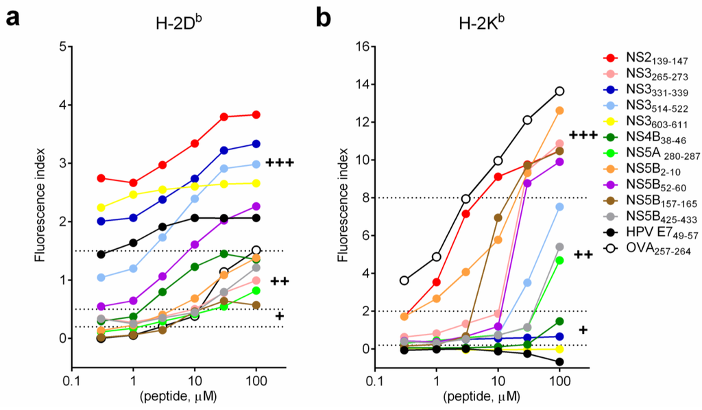 Binding affinity of HCV short peptides to MHC class I molecules. Short synthetic HCV peptides were serial diluted and incubated with RMA-S cells as described in Figure 1. (a) H-2Db; (b) H-2Kb. Dash lines indicate the cutoff values for H-2Db (0.2–0.5: weak binders (+); 0.5–1.5: intermediate binders (++); >1.5: strong binders (+++)) and H-2Kb (0.2–2: weak binders (+); 2–8: intermediate binders (++); >8: strong binders (+++)).