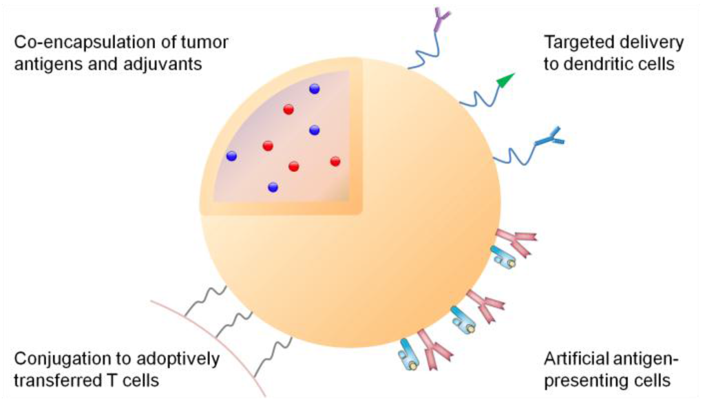 However, despite tremendous potential of cancer vaccines, successful treatment and eradication of tumors with cancer vaccines has been elusive due to insufficient induction of immune responses with conventional vaccination approaches []. This highlights the need for new vaccination strategies that can efficiently deliver tumor antigens and adjuvants to APCs and stimulate immune responses strong enough to kill tumor cells. In this regard, nanoparticles have been intensively investigated for over the past three decades as delivery vehicles of traditional chemotherapeutics targeted to solid tumors [,,,,,]. Repurposing these nanomaterials to target the immune system may offer new opportunities to tune immunity and elicit strong anti-tumoral immune responses [,,]. Indeed, multi-functional nanomaterials have several key advantages over conventional therapeutics for cancer immunotherapy (Figure 1): (1) nanoparticles carrying both tumor antigens and adjuvants can stably co-deliver vaccine components to APCs [,]; (2) nanocarriers with finely tuned size and a defined surface chemistry can achieve selective delivery to lymphoid tissues [,,], while nanoparticles composed of biomaterials with immune-stimulating properties may also serve a dual role as a vaccine carrier and an adjuvant, thus simplifying the vaccine design [,]; (3) surfaces of nanomaterials can also be engineered to display antigens and co-stimulatory ligands to serve as artificial APC (aAPC) and potentiate T cell immune responses [,]; (4) delivery systems designed to initiate immunogenic cell death or target immune checkpoint molecules can drive anti-tumoral immune responses and reverse immune suppression; and (5) therapeutics-loaded particles can be utilized to improve anti-tumoral efficacy of adoptive T cell therapy []. This review article covers exciting new developments in each of these key areas of research, highlighting the potential of nanoparticle-based immunotherapy against cancer.